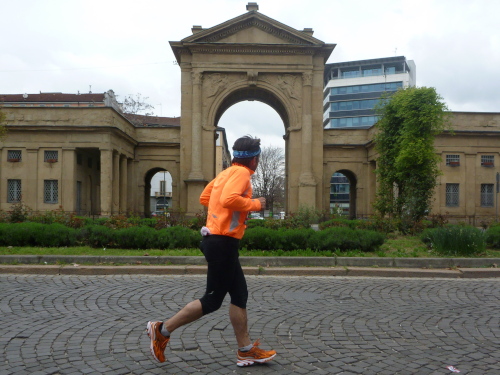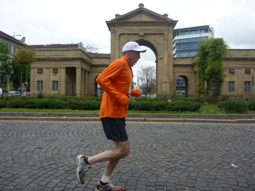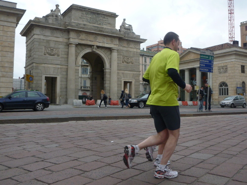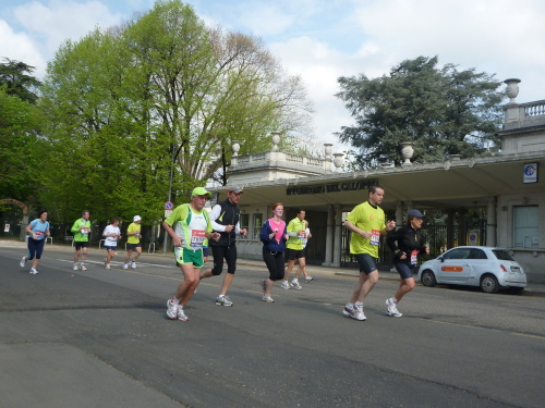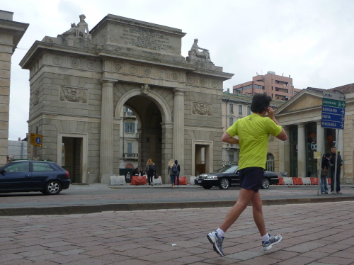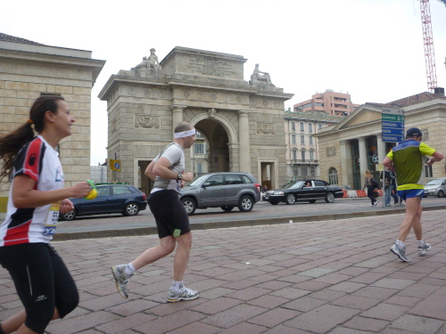 Der breite Corso Sempione wird von Radio Dee Jay beschallt. Ich habe bisher nicht herausgefunden, wie die Halbmarathonläufer zu erkennen sind. Jetzt erfolgt die Enttarnung. Stimuliert von der Musik setzen sie bereits zum Endspurt an. Ganz vorne sieht man das 1807 zu Ehren Napoleons erbaute Friedenstor. Es wird gerade renoviert. Außer dem Sechsspänner auf dem Bogen ist nichts zu sehen. Aber wir laufen sowieso links ab und verabschieden die „Halben“ beim Parco Sempione (km 20) ins Ziel.