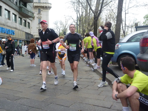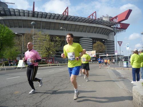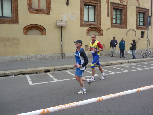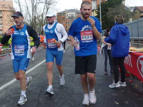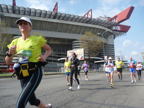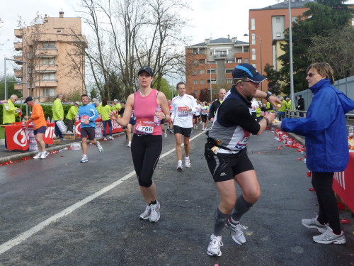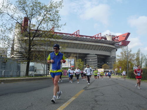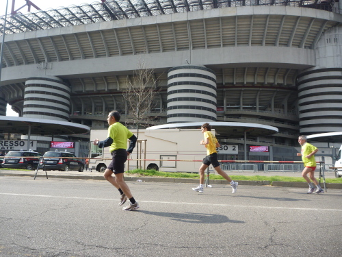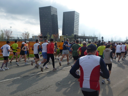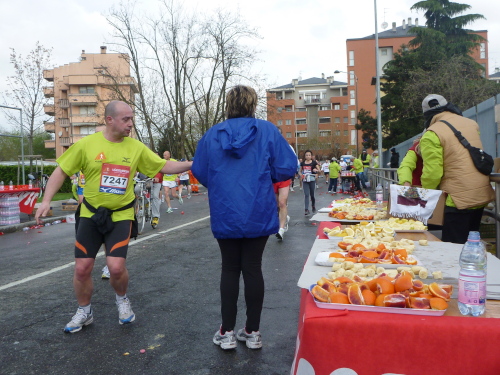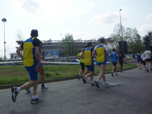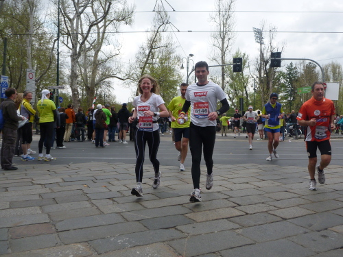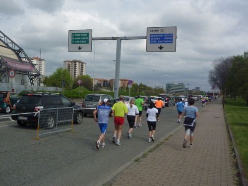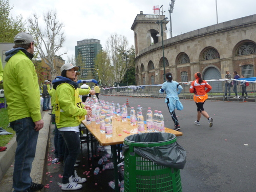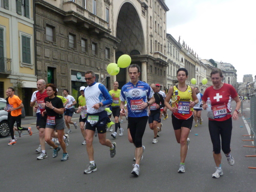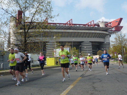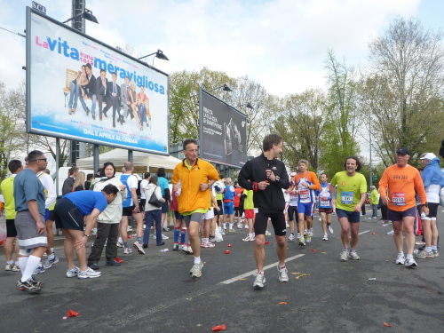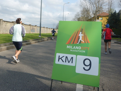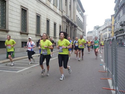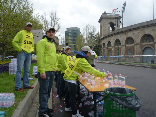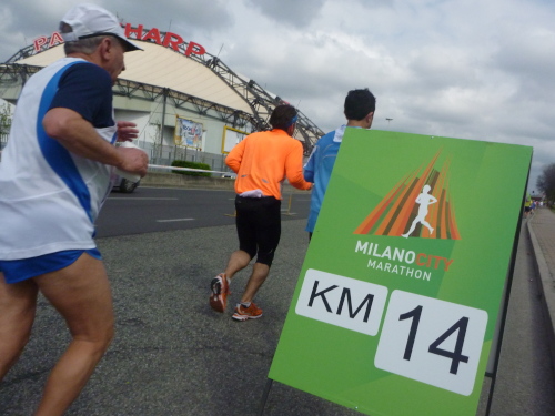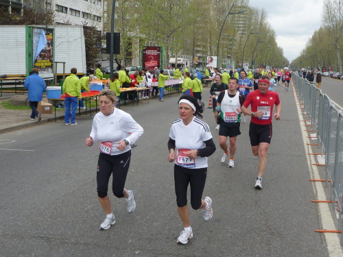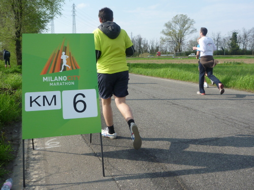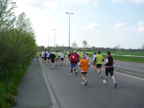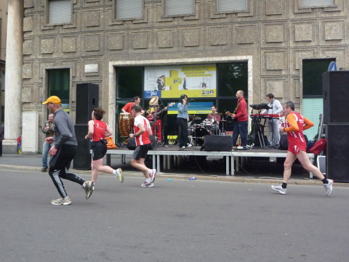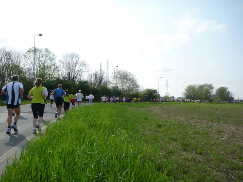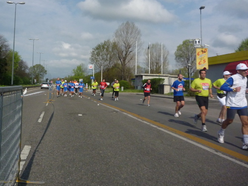 Bei km 5 erreichen wir die ersten Hochhäuser der Millionenstadt Mailand und die erste Verpflegungsstelle mit Getränken und Obst. Eine Straßenhälfte ist für die Marathonis gesperrt, auf der anderen ist nur wenig Verkehr. Vorübergehend wird es wieder etwas hektisch, als sich die schnellsten Staffelläufer auf der Ideallinie durchs Feld pflügen. Bei km 10 haben die Startläufer fertig und schicken ihre frische Kameraden ins Rennen.