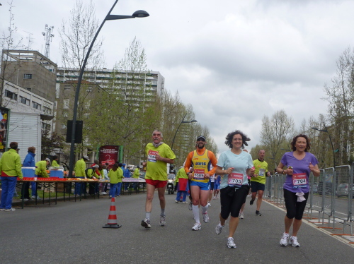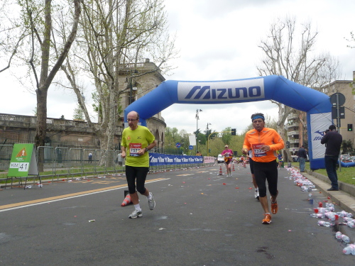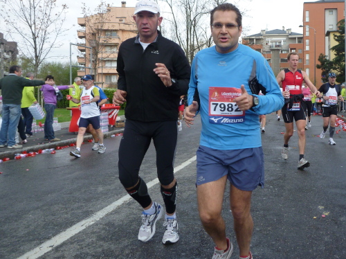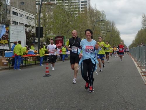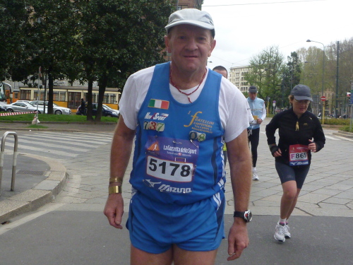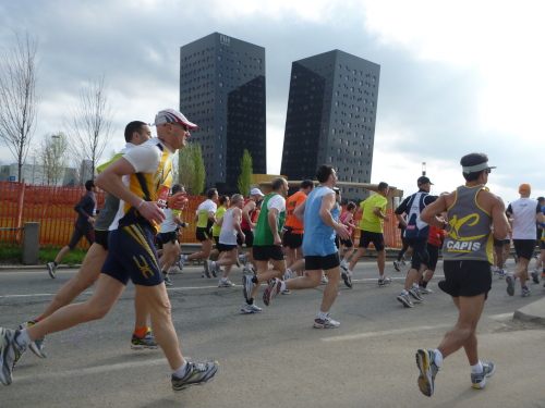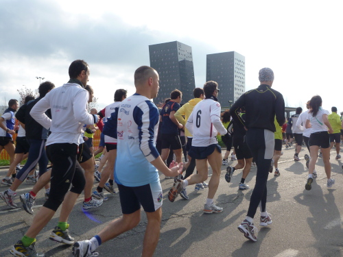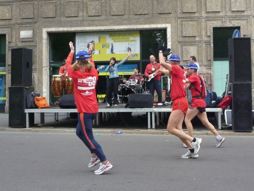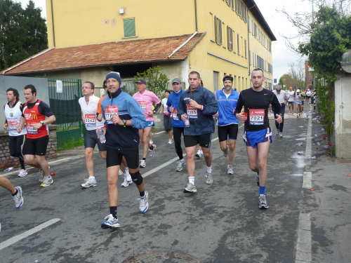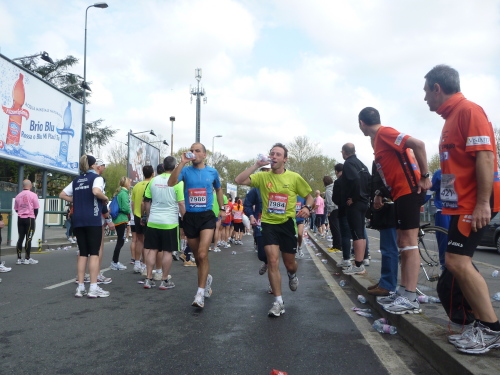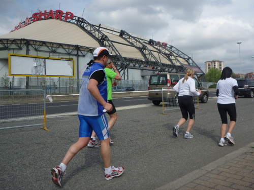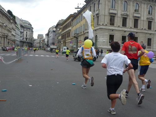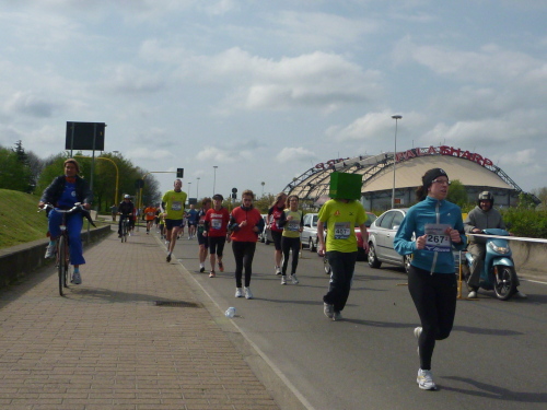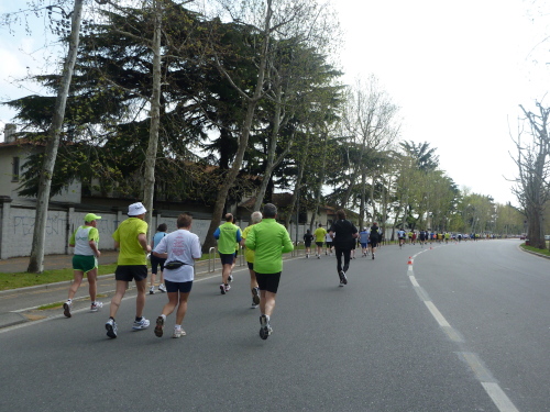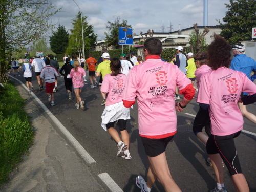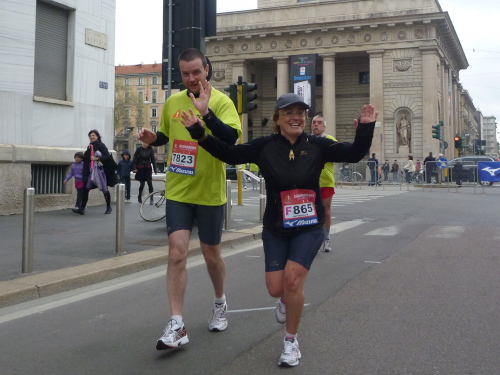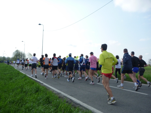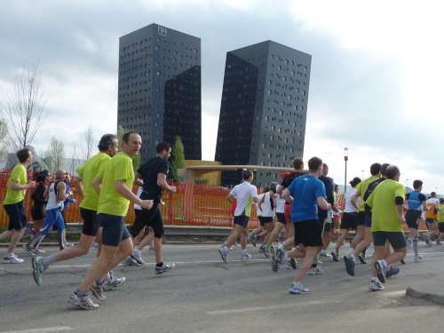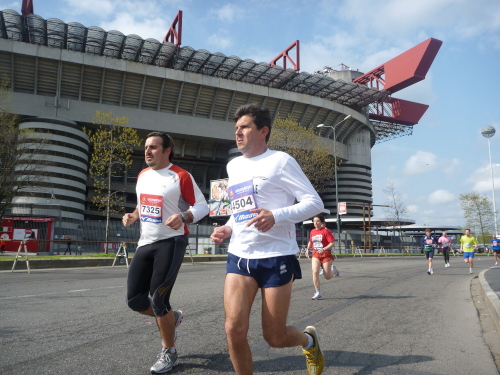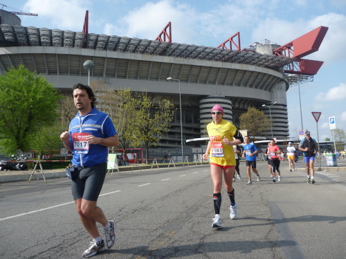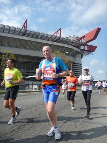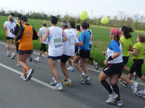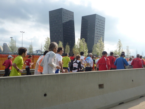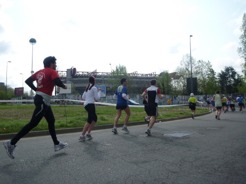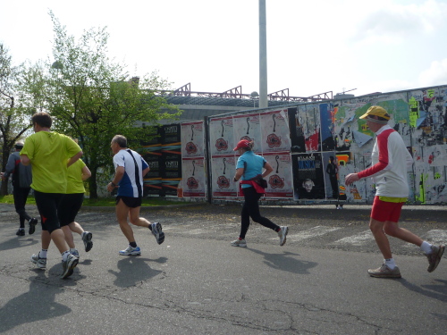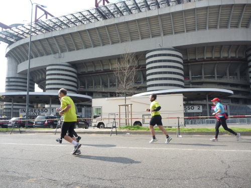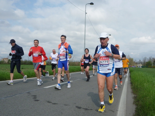 Bei km 5 erreichen wir die ersten Hochhäuser der Millionenstadt Mailand und die erste Verpflegungsstelle mit Getränken und Obst. Eine Straßenhälfte ist für die Marathonis gesperrt, auf der anderen ist nur wenig Verkehr. Vorübergehend wird es wieder etwas hektisch, als sich die schnellsten Staffelläufer auf der Ideallinie durchs Feld pflügen. Bei km 10 haben die Startläufer fertig und schicken ihre frische Kameraden ins Rennen.