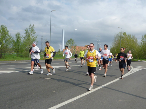 Es geht ab, wie bei der Feuerwehr. Es scheint, als wolle jeder seine Bestzeit toppen. Ich halte mich raus, mir haben es die schiefen Hoteltürme angetan, die ein nicht alltägliches Fotomotiv abgeben. Auf den nächsten Kilometern folgt wenig Spektakuläres, dafür viel Grün, Äcker und Wiesen, ein paar Gewerbebetriebe und vereinzelt ein paar Wohnhäuser. Mittlerweile bin ich im ruhigeren hinteren Teil des Feldes, wo ich entspannt mein Tempo laufe. Die Wolkenlücken werden größer, die Sonne scheint, die Temperaturen liegen bei 12 Grad. So kann es bleiben.