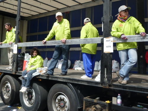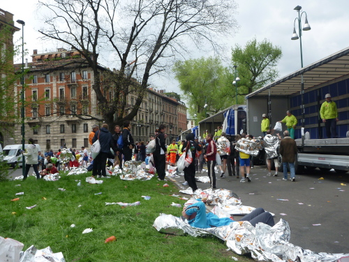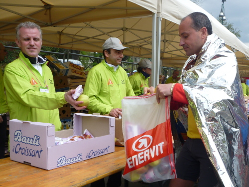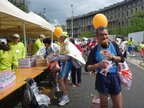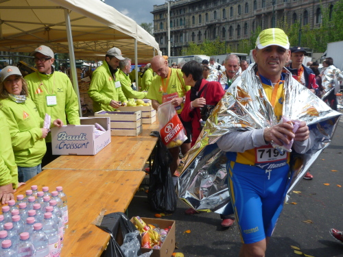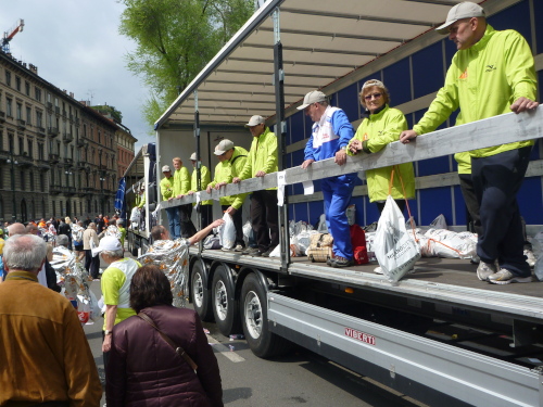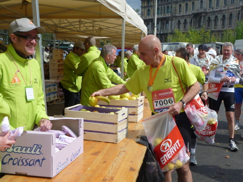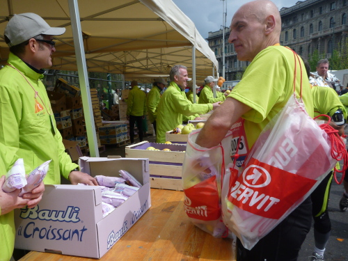 Nachdem man mir die Medaille, der man übrigens nicht ansieht, dass Mailand eine Designer-Hochburg ist, in die Hand gedrückt hat, komme ich an die Versorgungstische. Als erstes gibt man mir einen großen Plastikbeutel. Er ist leer und ich fürchte schon, „das war’s“. Weit gefehlt. Es folgen Tische mit verschiedenen Getränken, Äpfeln, Limonen, Orangen, Gebäck usw. Fleißige Hände helfen beim Einpacken. Wer sich erneut in die Schlange stellt, bekommt einen zweiten Beutel befüllt.