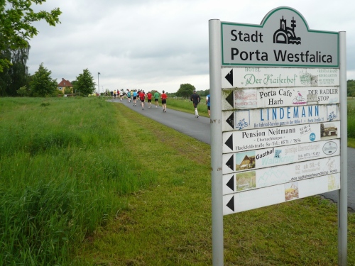 Es gehört ein bißchen Organisationstalent dazu, hier am Marathon teilzunehmen, Hotels und ÖNV sind nicht optimal. Am Besten sollte man sich ein DB-Fahrrad am Bahnhof Minden nehmen. Meine Anfrage bei Porta!, ob ich die Nacht im Teppichlager des Möbelhauses probeliegen könnte, wurde leider negativ beantwortet. Ist auch irgendwie verständlich, aber ein preisgünstiges Hotel für einen, der mit der Bahn anreist, ist eine Weltreise entfernt.