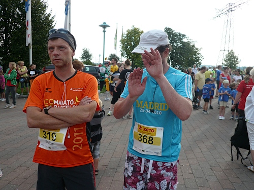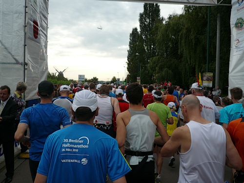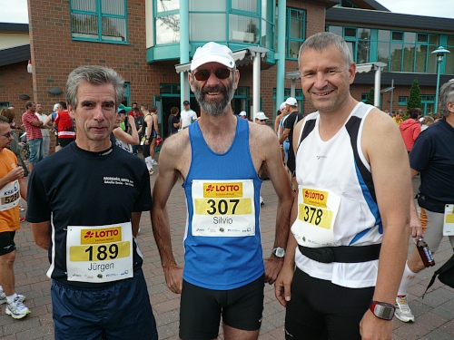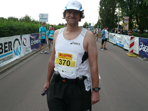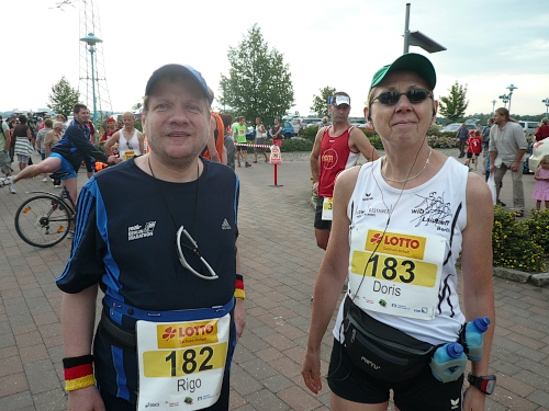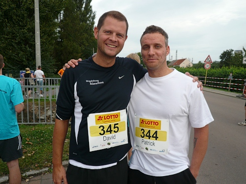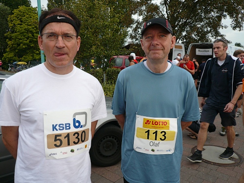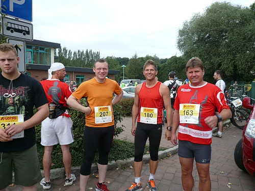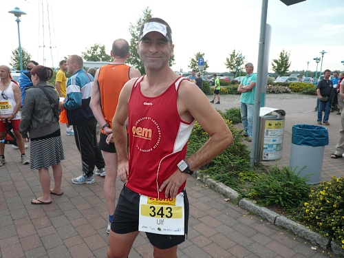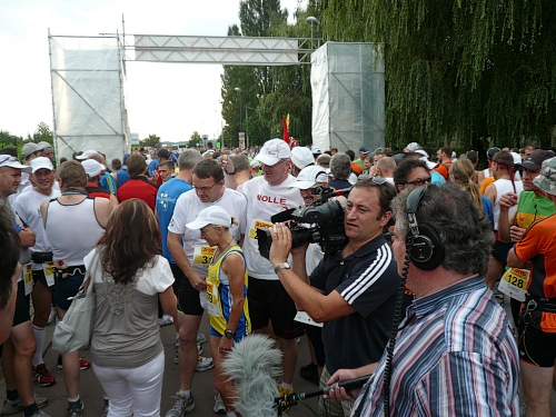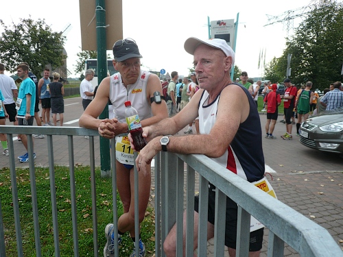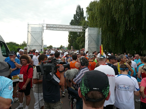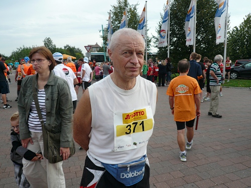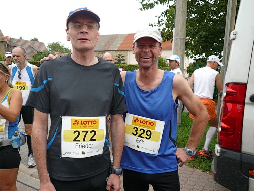 Um 7:22 geht die Regiobahn nach Süden, nach Merseburg, von dort geht ein Shuttlebus zum Startort Spergau. Wir sind nur eine Handvoll Marathonläufer, die meisten reisen mit dem Auto an, nehmen dann nachmitttags den Shuttlebus zurück nach Spergau. Alles ganz locker und entspannt.Um 8:05 bin ich dort und hole mir erstmal ein paar Tips von Waldemar Cierpinski (PB 2:09:55). Alles läuft stressfrei ab, er hat viel Zeit für mich, das tut gut. Was die Cierpinskis laufend leisten, ist ein anderer Sport, als ich ihn betreibe. Der Unterschied ist vielleicht so wie zwischen Tennis und Federball.