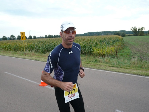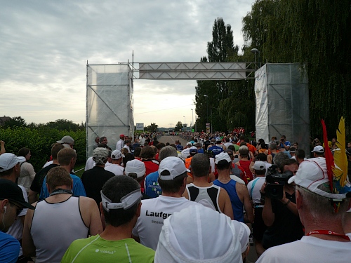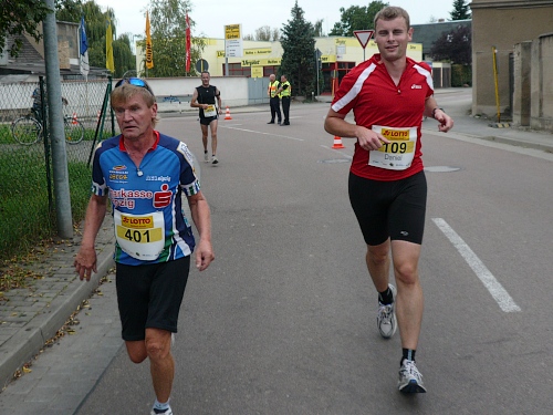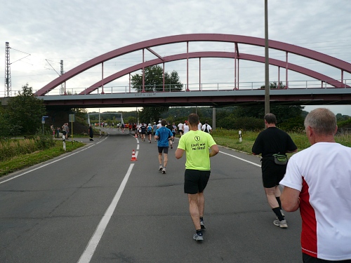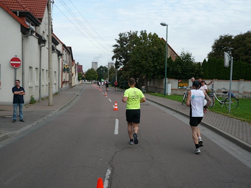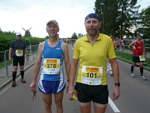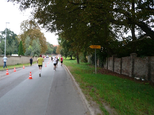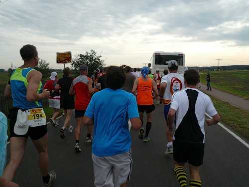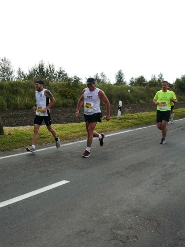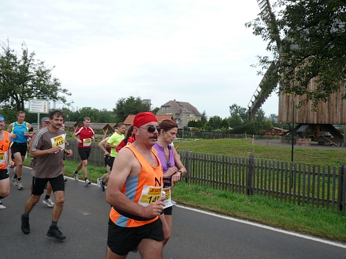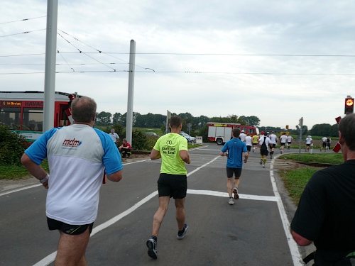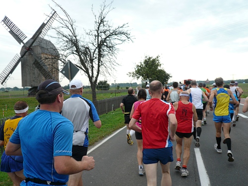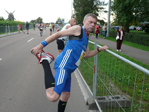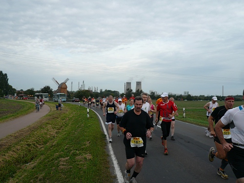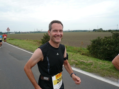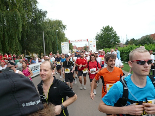 Ich merke, dass ein Olympiasieger die Streckenführung geplant hat: Waldemar war es wichtig, eine schnelle Strecke zu kreieren, darum geht es meistens schnurgerade auf langen Wegen entlang des Industriegebietes oder durch die ewig langen Straßendörfer. Meine Füße klatschen auf das Kopfsteinpflaster, ich kippe mir jede Menge Wasser über meinen Steinzeitschädel, aber ich laufe gut, sehr gut.