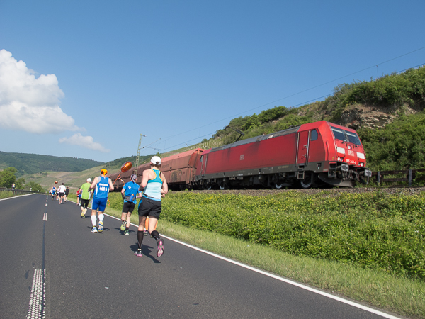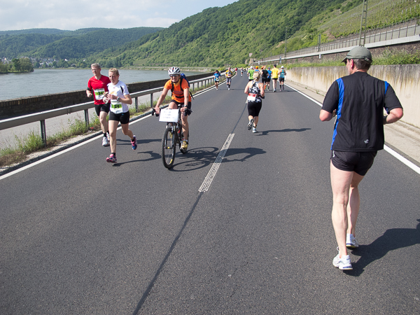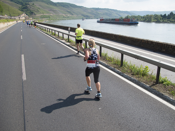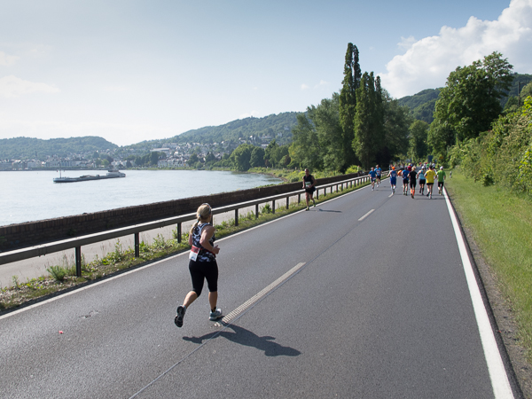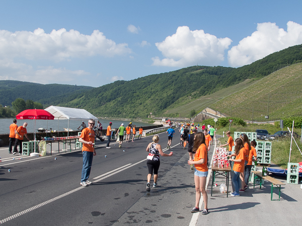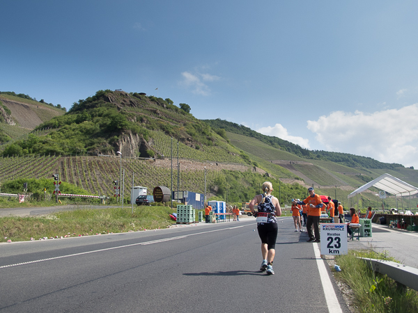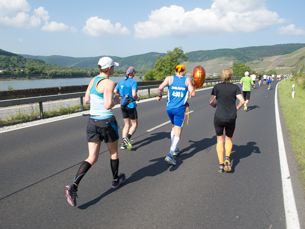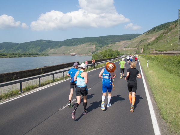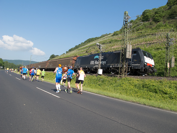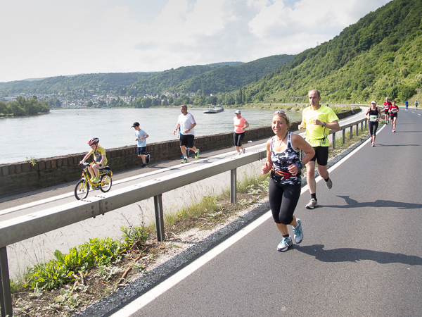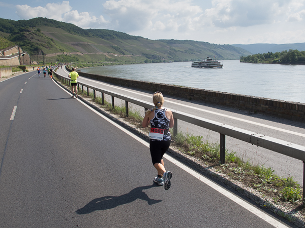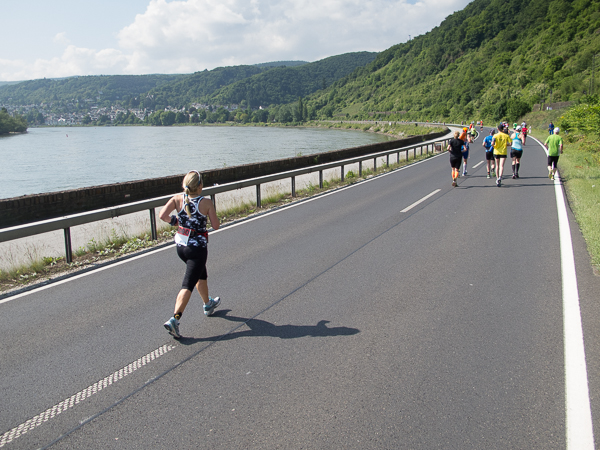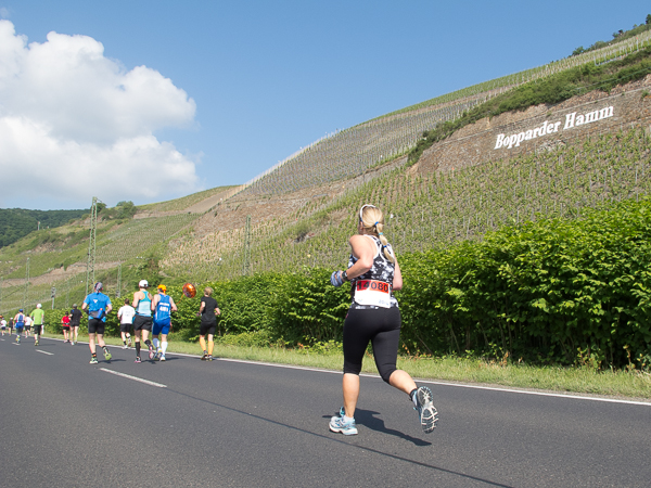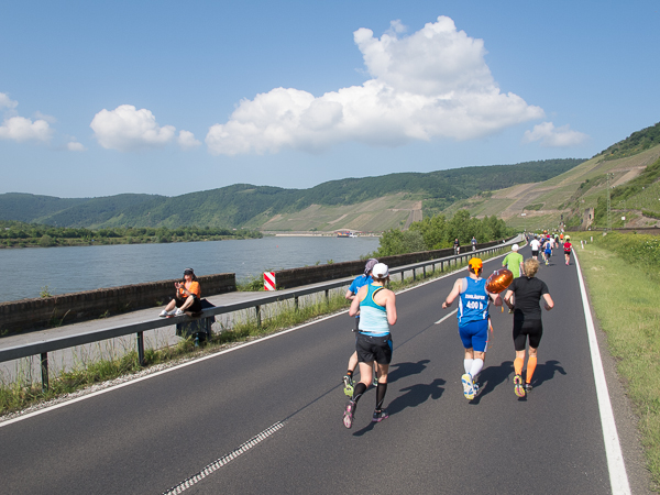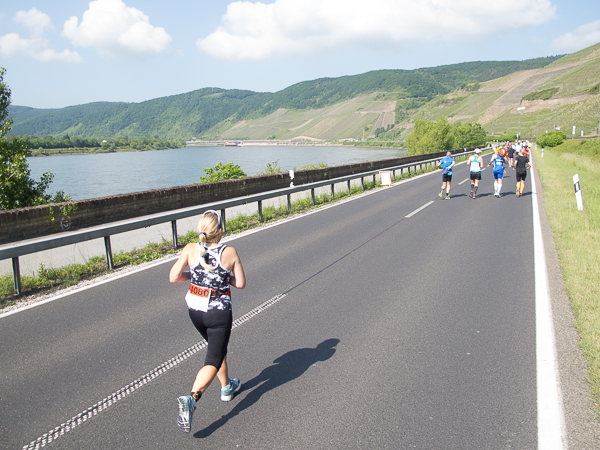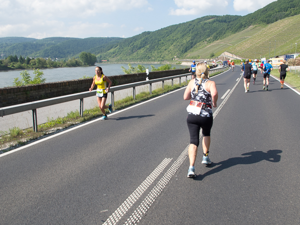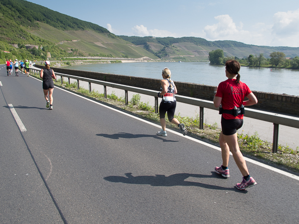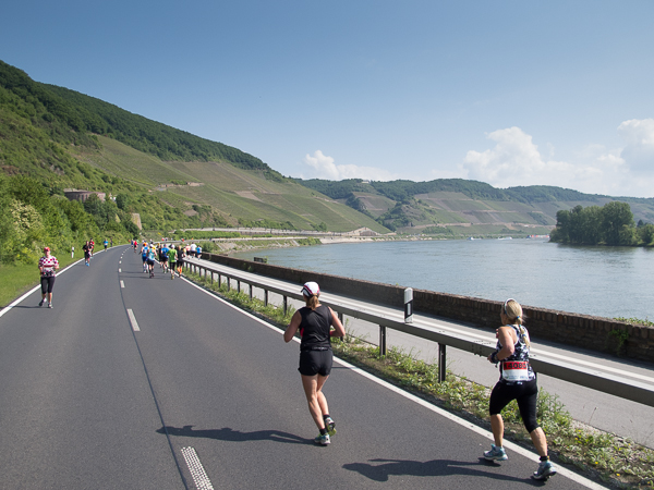 Kilometer siebzehn. Noch immer laufen wir gegen den Strom, nun kommt die Spitze der Marathonläufer uns entgegen. Der warme Wind lässt die Blätter an den Weinstöcken rascheln. Hier heißt es Handlese an Steilhanglagen. Die Straße an der Rheinbiegung wird zur Riesling-Spur. Feinster Wein aus dem 75 Hektar großen Weinbaugebiet Bopparder Hamm spiegelt die fast zweitausend Jahre alte Kultur am Mittelrhein wider. Die höchste Erhebung ist die Fleckertshöhe mit 531 Metern über NN.