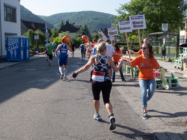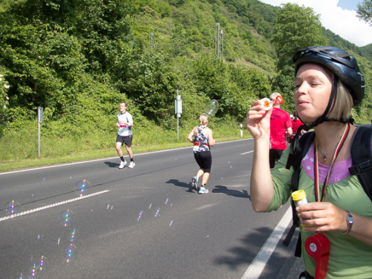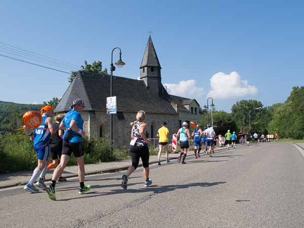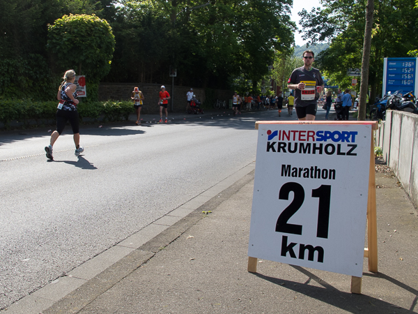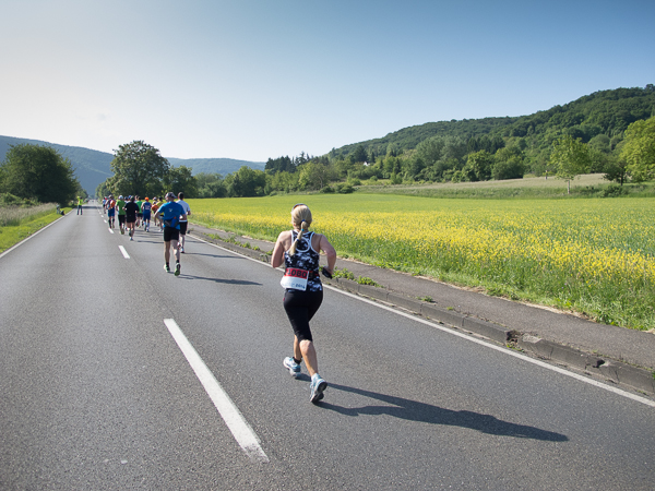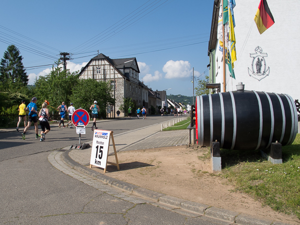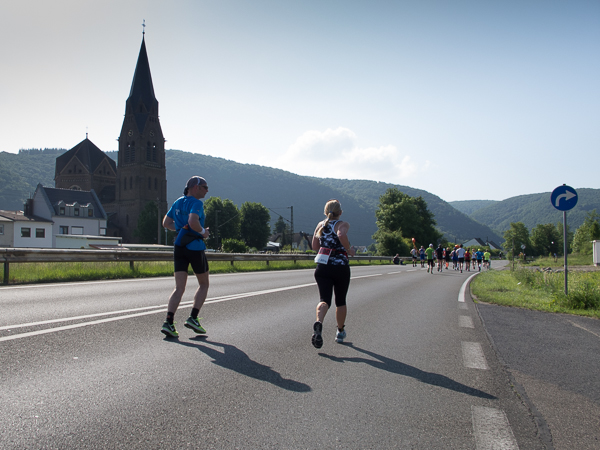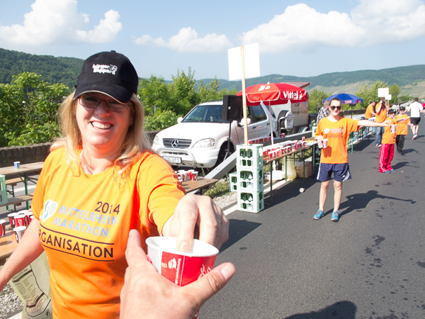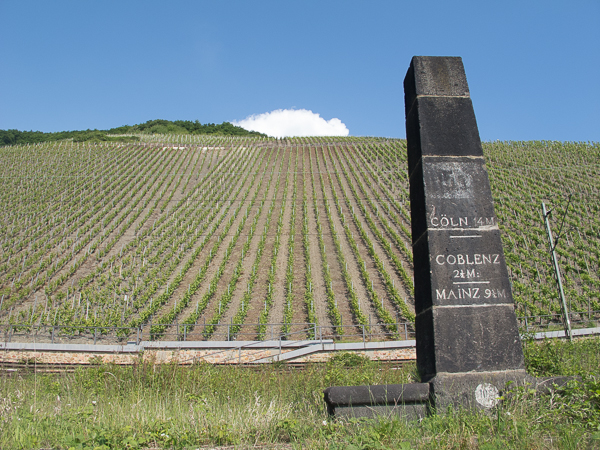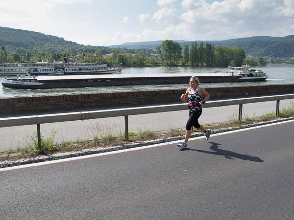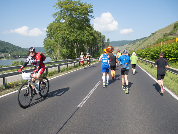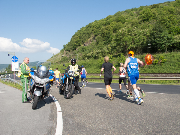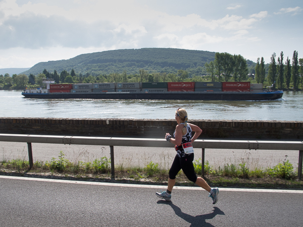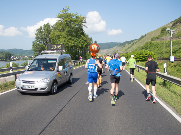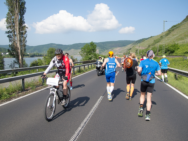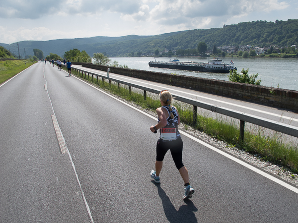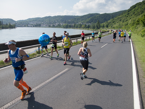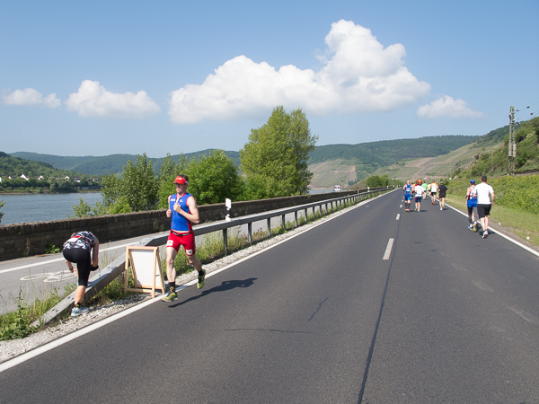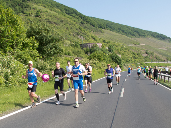 Kilometer siebzehn. Noch immer laufen wir gegen den Strom, nun kommt die Spitze der Marathonläufer uns entgegen. Der warme Wind lässt die Blätter an den Weinstöcken rascheln. Hier heißt es Handlese an Steilhanglagen. Die Straße an der Rheinbiegung wird zur Riesling-Spur. Feinster Wein aus dem 75 Hektar großen Weinbaugebiet Bopparder Hamm spiegelt die fast zweitausend Jahre alte Kultur am Mittelrhein wider. Die höchste Erhebung ist die Fleckertshöhe mit 531 Metern über NN.