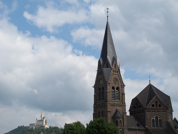 Zurück in Spay. Jetzt aus dieser Richtung wird sie von einem 160 Meter hohen Felsen auf der anderen Uferseite erst richtig sichtbar. Die hohen Mauern und Zacken der wohl berühmtesten Burg am Mittelrhein. Die Marksburg, einst Zeichen von Macht und Größe. Sie ist beachtlicherweise die einzige nie zerstörte mittelalterliche Höhenburg am Mittelrhein.