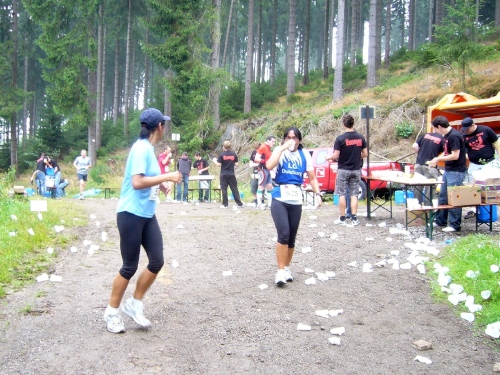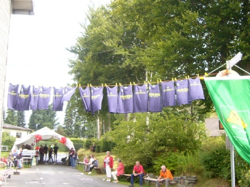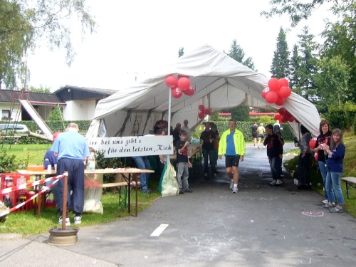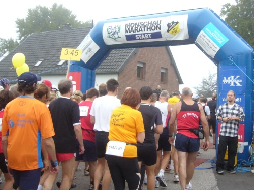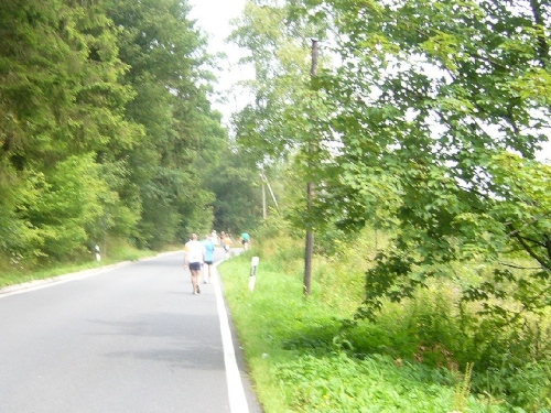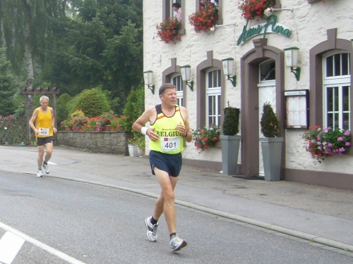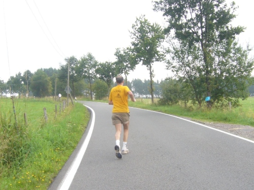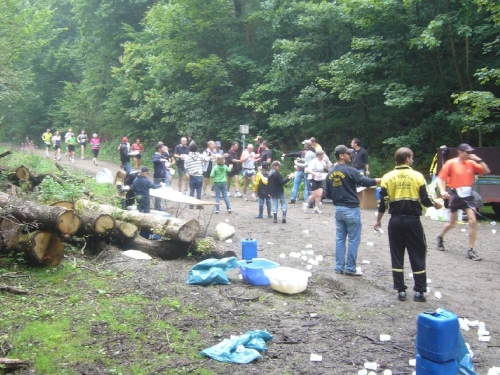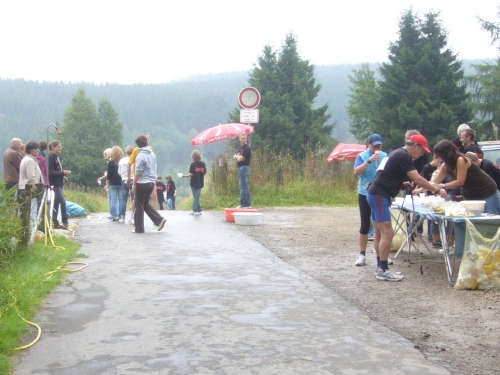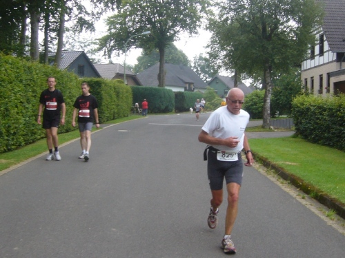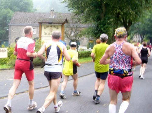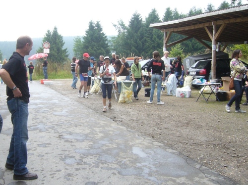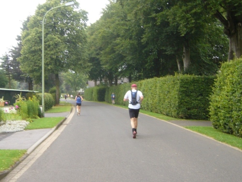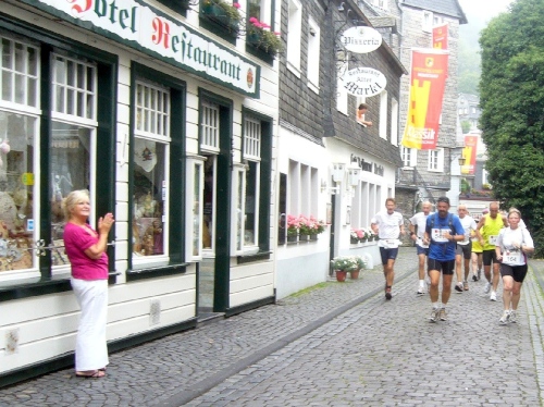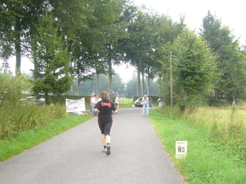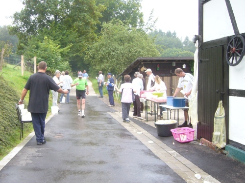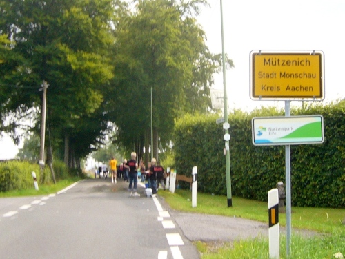 Nach einem kurzen flachen Stück geht es wieder bergauf zum Km 28 am Ortsbeginn von Kalterherberg. Durch den ca. 3km langen Ort geht es leicht bergab. Dieses Grenzdorf nach Belgien besteht offensichtlich nur aus einer Häuserreihe links und einer Reihe rechts der Straße. Schon ab Ortseingang befinden sich Privatversorgungen der Anwohner. Hier wird den Teilnehmern alles gereicht was das Herz begehrt, Müsliriegel, Kuchen, Gummibärchen, Schokolade und vieles andere.