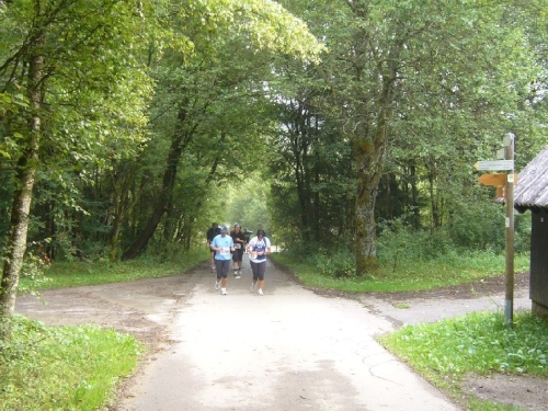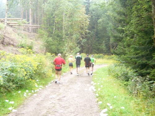 Wir kommen in den Rohrener Wald, eine stille und schöne Landschaft mit immer wieder atemberaubenden Aussichten. Es geht abwärts ins Hölderbachtal. Dann wird es richtig steil und es geht lange bergauf. Zwei Kilometer auf schlechtem Untergrund, ich gehe und alle um mich herum auch. Am Ende des Berges wartet eine Verpflegungsstation auf uns. Wasser, Wasser und weiter. Jetzt geht es wieder runter und nach 3 km kommt der nächste Aufstieg von ca. 1 km bis Km 17. Danach geht es weiter moderat ansteigend weiter.