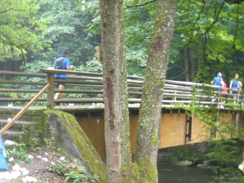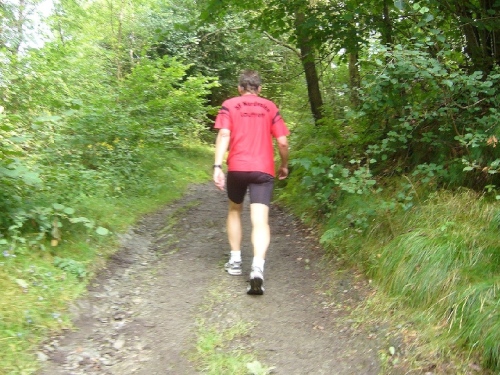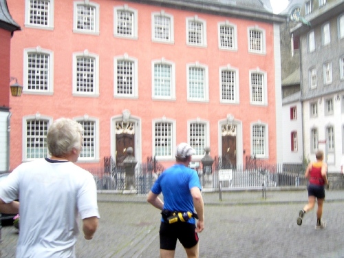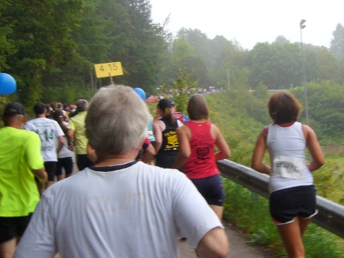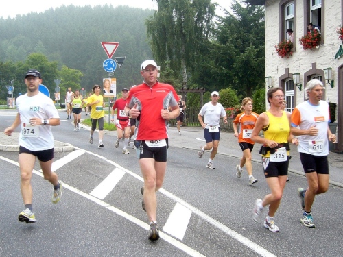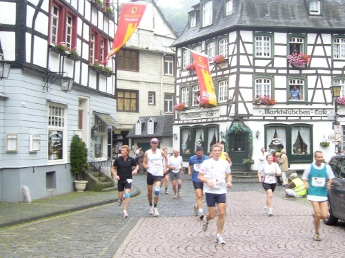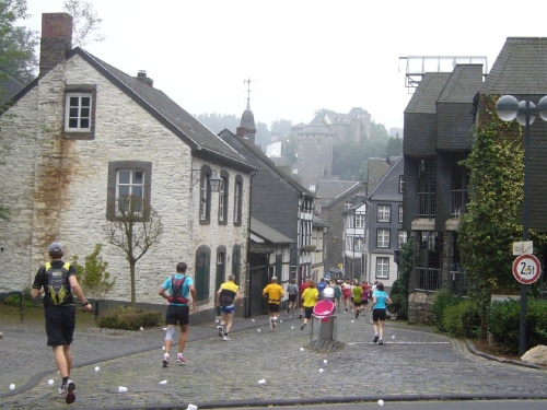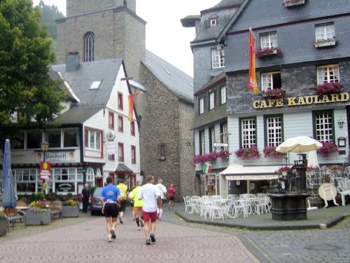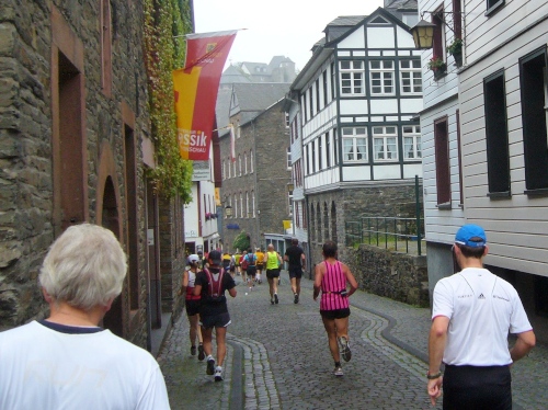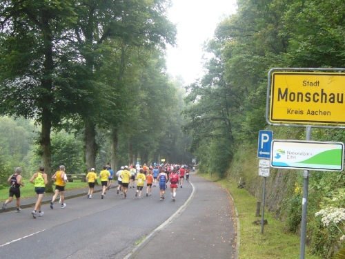 Wir verlassen die Stadt über die Rur und laufen linksseitig dem Fluss entlang. Hinter Km 7 überqueren wir die Rur über eine Holzbrücke. Jetzt kommt der erste harte Anstieg über ca. 300m Länge. Die LäuferInnen um mich gehen diesen Anstieg, da er auch noch sehr rutschig ist. Der Weg führt weiter bergauf und gibt teilweise einen herrlichen Blick frei über das tiefe Rurtal und die bewaldeten Höhen.
