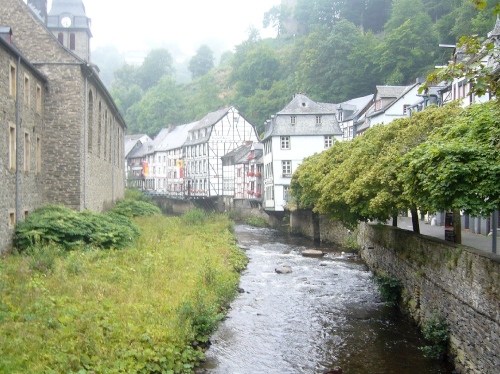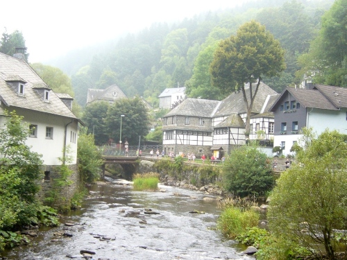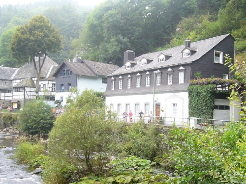Wir erreichen die Altstadt von Monschau und laufen direkt auf das Rote Haus zu. Johann Heinrich Scheibler hat dieses Haus 1752 erbaut. Es ist noch komplett im Rokoko-Stil eingerichtet und gibt Einblick in den Glanz damaliger großbürgerlicher Wohnkultur. Sehenswert ist das Herrenzimmer mit seiner kostbaren Leinwandtapete sowie der mit einem Wappenservice gedeckte Tisch im Esszimmer. Weltberühmt ist auch die über 3 Etagen freitragend gebaute Wendeltreppe, in der 21 kleine Puttenszenen an die verschiedenen Stationen der Tuchherstellung erinnern.