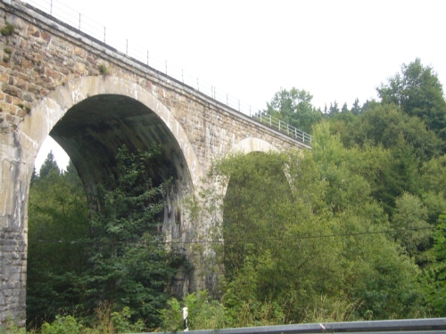 Nach 2/3 des Ortes biegen wir links ab über eine leicht abfallende Teerstraße Richtung Rurtal. Die Strecke verläuft jetzt an der Rur entlang auf unebenen Wald- und Feldwegen. Wir laufen ein Stück der alten Vennbahn entlang und kommen hinter der Steinbrücke wieder auf die Teerstraße. Vorm Viadukt, das wir unterqueren, liegt rechts im Wald das Gut Reichenstein, bei ca. Km 34. Es geht weiter bergab bis zum Hotel Leyloch wo sich ein Wasserstand befindet. Nun geht es ohne Schatten 1,5 km lang einer Teerstraße mit sehr heftigem Anstieg entlang. Bei Km 36 geht es weiter bergauf, aber deutlich sanfter, bis zum Ortsrand von Mützenich.