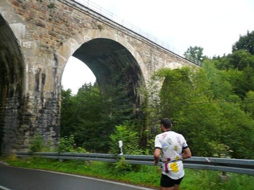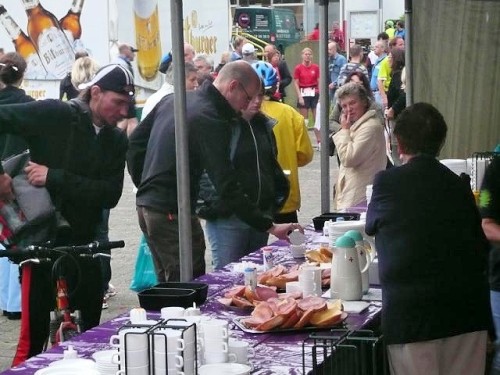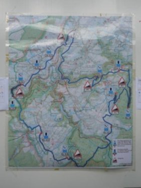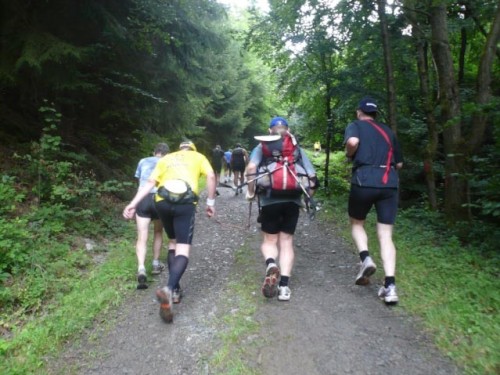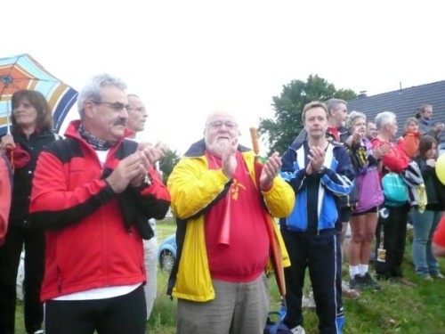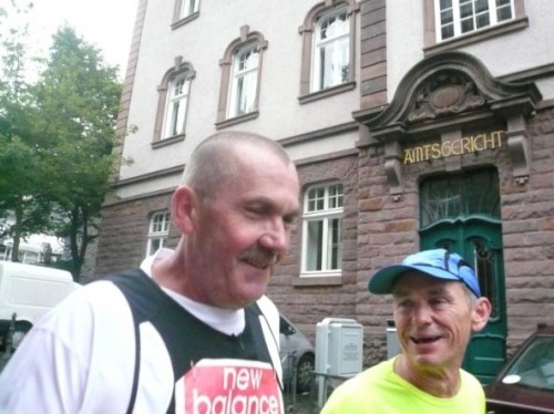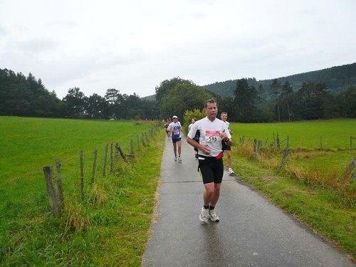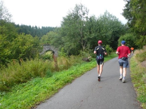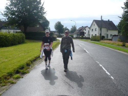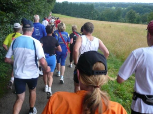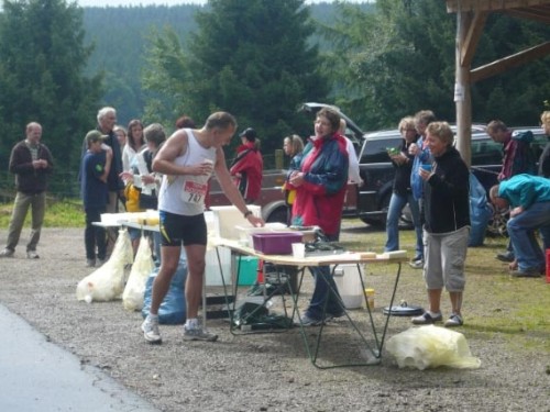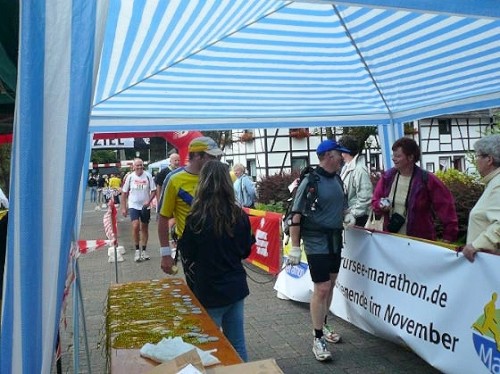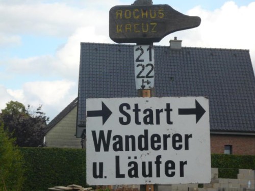 Der Konzener zieht weiter und ich laufe einen Kilometer mit Didi. Didi ist blind und sein „Guide“ muss mal pinkeln. Er erzählt von den Schwierigkeiten, die er mitunter hat, jemanden zu finden, der mit ihm läuft. Ich wundere mich, dass es im Netz noch keine Seiten gibt, in denen man sich zum Suchen und Finden eintragen kann. Didi läuft heute seinen 80. Marathon. An der nächsten Verpflegungsstelle wartet er auf seinen Mitläufer und für mich geht’s weiter nach Kalterherberg.