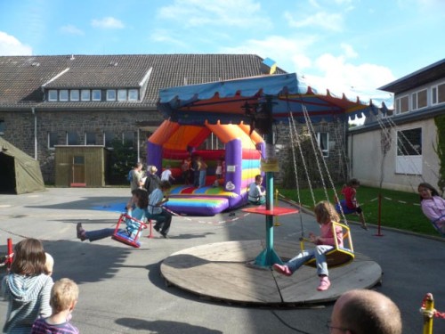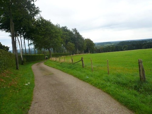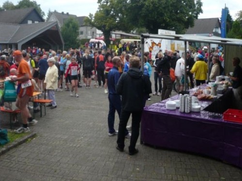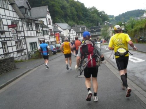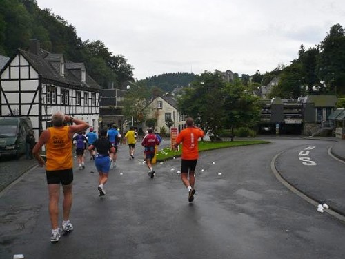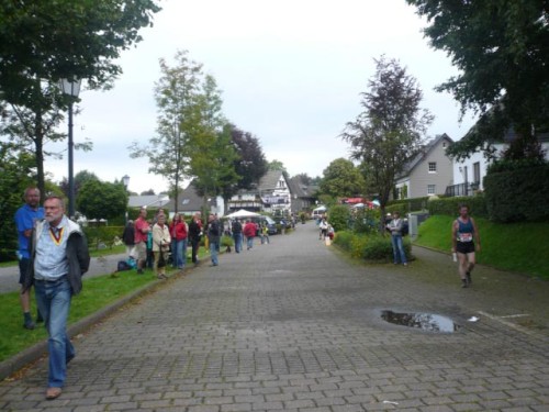 Gleich darauf hört es tatsächlich auf zu regnen. Vor der Verpflegungsstelle „Gut Heistert“ gibt es nochmals ein kurzes, steiles Stück zu bewältigen. Vor mir saust einer im irren Tempo den Berg hoch und bekommt einen Wahnsinnsjubel. Lokalpatriotismus pur. Hermann-Josef kommt aus Konzen, den kennt hier jeder. Wir laufen ein paar Meter gemeinsam. Er läuft heute seinen ersten Marathon, hat prima Laune und hofft, dass er so mit 4:45 ins Ziel kommt. Das wird er: mit 4:44! Tolle Leistung beim ersten Mal und so einem Profil! Glückwunsch!