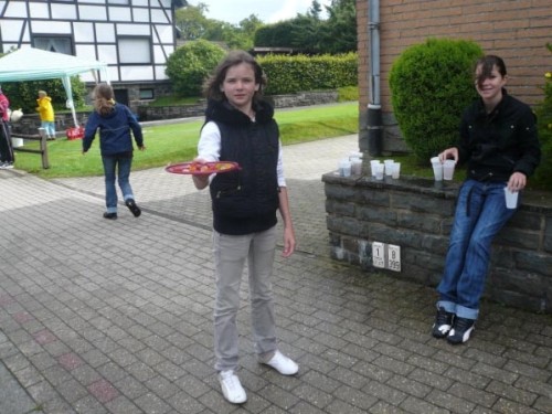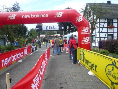 Kurz vor dem Ziel ist noch etwas, das meine Beine nun eigentlich nicht mehr brauchen. Aber die Qual hat schnell ein Ende. Danach erblicke ich den Kirchturm von Konzen und vorbei an beglückwünschenden Zuschauern geht’s hinein in den Ort, den ich vor einigen Stunden verlassen habe. Hier im Ziel steht manch einer wohl schon sehr lange. Irgendjemand spricht die Namen der Finisher müde in den Lautsprecher. Mich wundert es gar nicht. Ist auch gar nicht schlimm. Ich war in Mützenich schon eine Heldin, zweimal am Tag wäre nun echt zuviel.