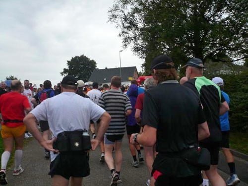 Man trifft sich um 7:50 Uhr auf dem Dorfplatz und geht gemeinsam oder kleckerweise zum Start am Dorfausgang. Es fängt an zu regnen. Neben mir steht einer, der mich an Obelix erinnert: „Ist ja ganz angenehm, oder?“ Hä? Also mir ist saukalt, aber ich nicke vorsichtig und murmele ein „na ja“. Endlich geht’s los. Ich freu mich auf die wärmende Bewegung. Vorbei geht’s an Kuhweiden und Pferdekoppeln in den Wald hinein. Hier ist es wärmer und der Regen spielt keine Rolle mehr.