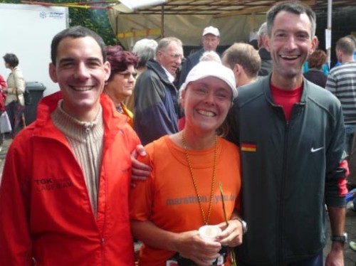 „Schreibst du für marathon4you?“ spricht mich eine Läuferin an und ich stelle fest, dass ich sie schon oft auf Fotos gesehen habe. Es ist Renate (in der AK W60 sehr erfolgreich und Vielläuferin, heute: 3. Platz). Leider geht sie gerade ein Stück. Wir plaudern ein wenig, aber mir ist es zum Gehen viel zu kalt. Schade. Nass und fröhlich verabschieden wir uns.