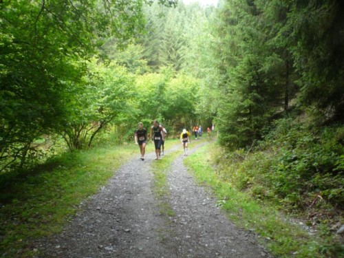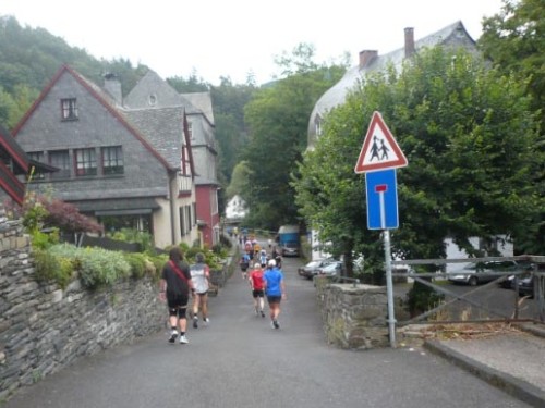 Nach Monschau geht es eine Weile an der Rur entlang. Die Läufer finden langsam ihren Rhythmus. Und kommen bei Kilometer 7 abrupt wieder heraus aus selbigen. Eine kurze, steile Passage führt nach der ersten Verpflegungsstation hoch in den Wald. Kaum vorstellbar, dass die Ersten hier im Laufschritt hochgekommen sind. Danach wird es wieder ruhig.