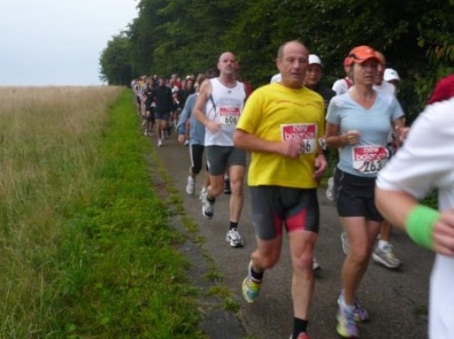 Ruhig ist hier aber nur die Strecke. Zwei Läuferinnen unterhalten sich unaufhörlich. Die Vorstellung, dass sie vermutlich noch weitere 30 Kilometer schwatzend um mich herum verbringen, treibt mich nach vorn. Ich muss mich für diese etwas feindliche Haltung entschuldigen, ich habe gar nichts gegen einen kurzen Plausch, aber ich liebe Landschaftsläufe auch deswegen, weil man der Natur lauschen kann. Heute vorwiegend den Regentropfen. Zwischen zwölf und vierzehn Kilometern soll die Strecke fies ansteigend sein – habe ich mir extra gemerkt. So schlimm ist es aber nicht. Einige gehen, andere laufen langsam hinauf.