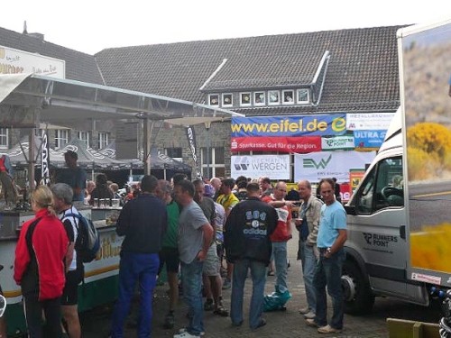 Samstagnachmittag: Der kleine Ort Konzen und sein Monschau-Marathon empfangen mich mit Sonnenschein und fröhlichen Gesichtern. Mountainbiker kommen gerade von ihrer Tour auf der Marathonstrecke zurück und mischen sich unter die Läufer und Einheimischen, die sich auf dem Dorfplatz tummeln. Ich hole meine Startunterlagen, stelle meinen Rucksack unter, gehe ein bisschen spazieren und schaue mir das Treiben erstmal aus der Entfernung an. Kleines hübsches Dorf mit ordentlich viel Grün drum herum.
