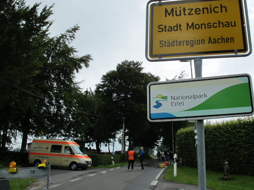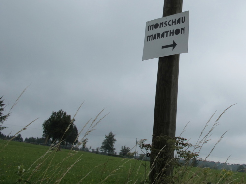 Nach ungefähr 1,5 km haben wir den westlichen Zipfel von Mützenich erreicht. Offensichtlich auch so ein „langer“ Ort. Diesmal laufen wir aber nicht durch, sondern 3 km um den Ort herum. Höhepunkt ist dann der östliche Zipfel (km 39). Über die Straße ist ein Zelt gebaut, davor hängen an einer Leine die Shirts der örtlichen LG. Lustig geht es zu. Kaum kommt ein Läufer in Sichtweite, wird er mit allerlei Lärminstrumenten begrüßt. Süß lächelnd wird mir ein Löffelchen entgegengehalten. „Honig, ist gut für Dich.“ Ich weiß.