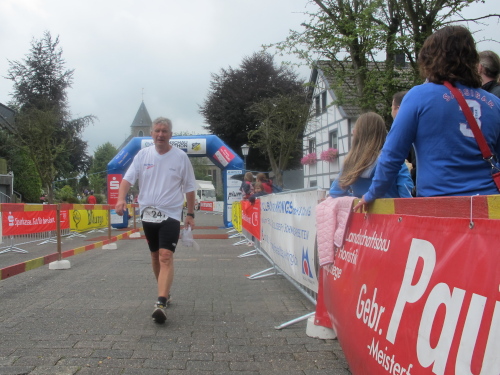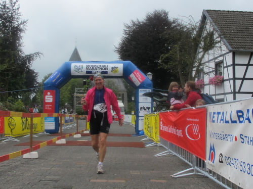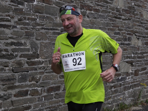 Es geht abwärts zur Rochusmühle und zum Troisdorfer Weiher (km 41). Dann kommt noch einmal ein beschwerliches Stück auf schmalem und rutschigem Pfad hinauf nach Konzen. Oben angekommen, sieht man schon den Kirchturm und man hört den Sprecher. Gleich ist es geschafft. Vorbei an der Kirche geht es zum Zieleinlauf. Viele Zuschauer sind jetzt nicht mehr hier. Die stehen für Gegrilltes, Pommes oder vor einem Zapfhahn Schlange. Die Marathonfete ist nämlich bereits voll im Gange.