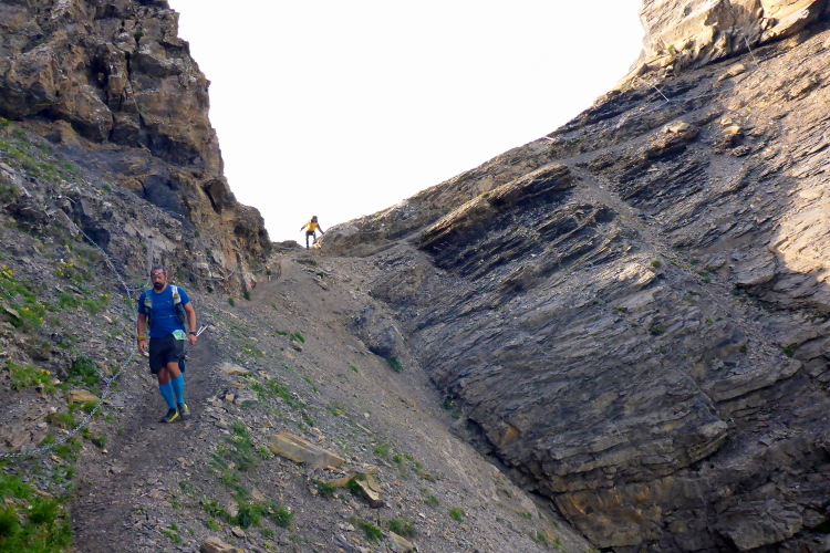 Wir ziehen unterhalb eines Gipfels durch kantiges Blockwerk und das ein und andere Altschneefeld. Immerhin geht es zum ersten Mal flach. Viele Wegabschnitte sind jetzt in den Felsen gehauen. Vor mir hat ein Läufer sichtlich mit Höhenangst zu kämpfen. Die vorhandenen Seilversicherungen und Ketten nehme auch ich an einigen haarigen Abschnitten gerne an. Ein Stolpern könnte hier fatale Folgen haben. Kurz vor dem höchsten Punkt wird an einem Felsüberhang unsere Nummer gescannt.