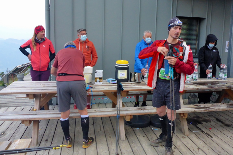 Im Downhill zur Verpflegung in Les Fers fängt es an zu regnen. Wir machen eine längere Pause. Einige Läufer sind schon da. Ein Helfer zeigt uns unsere Platzierung. Viel seien schon ausgestiegen in Le Sepey. Draußen regnet es wolkenbruchartig. Es hilft ja nichts: Regenjacke an und raus. Der Regen hat aber nur kurz nachgelassen. Nach 5 Minuten öffnet der Himmel seine Schleusen und gibt alles, was er hat. Schnell ziehen wir die Regenhosen über und stolpern durch die nassen Wiesen.