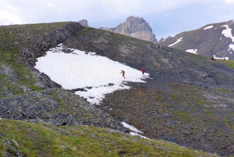 Fünfeinhalb Stunden haben wir bis hierhin gebraucht. An der nächsten VP in Solalex ist nach 9 Stunden Cutoff. Das ist gut zu schaffen. In meinen Flaschen ist jetzt Grenadine- und Cassis-Sirup. Frisches Wasser kann man direkt aus den Brunnen oder am Bach trinken. Ich nehme noch eine Bouillon und weiter geht’s. Der nächste Anstieg geht lange durch loses Geröll und über Grasmatten. Die Sonne scheint und es ist sehr warm. Weiter oben ziehen ständig Wolkenfetzen an uns vorbei und kühlen uns etwas. Bei mir stellt sich Müdigkeit ein, was auf diesen Strecken gefährlich ist. Jede Unachtsamkeit wird bestraft. Ich nehme ein Gel mit Coffein, und es läuft wieder besser.