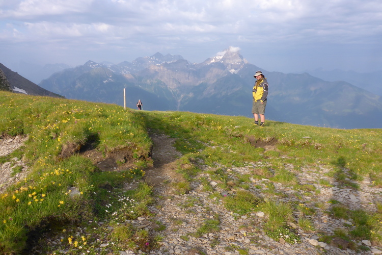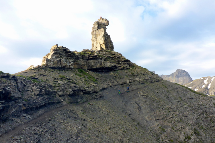 Die Sonne kommt jetzt ab und zu durch und wärmt uns ein wenig. Sie taucht die ockerfarbenen Felsen an der Pointe de Martinets in ein warmes Licht. Der Blick reicht bis zum Genfer See nach Montreux und auf die fantastische Bergwelt rundherum. Bizarre, zerklüftete Felsen ragen in den Himmel. Die Strecke ist traumhaft schön. An einer besonders haarigen Stelle stehen Helfer der Bergwacht. Ich genieße die fantastischen Ausblicke in die Tiefe. Die Höhe vertrage ich gut. Der höchste Punkt des Rennens ist aber auch nicht höher als 2522 Meter.