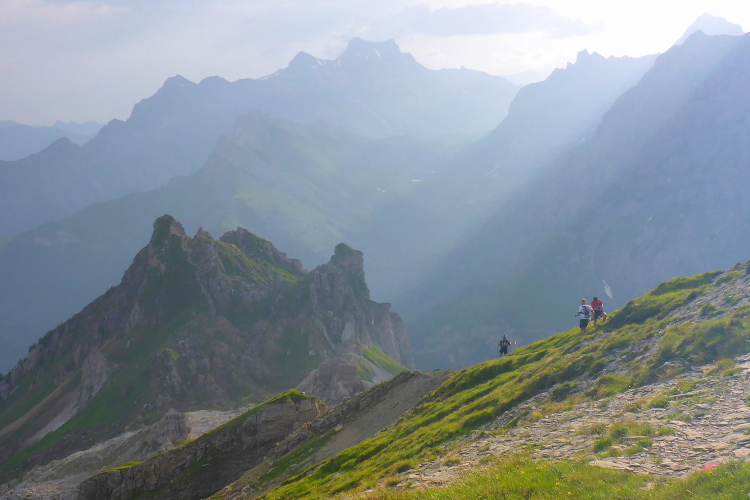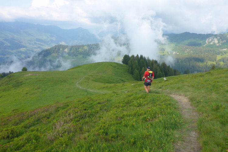 Nach dem VP steigen wir wieder eine Skipiste hoch, bis zur Bergstation der Liftanlage am Roc dÒrsay. Noch ein Peak, dann geht es in einen langen Downhill tief hinunter nach Sepey, wo unser Dropbag auf uns wartet. Die Sonne hat jetzt wieder die Übermacht, aber es wird nie zu warm. Perfektes Wetter. Wir steigen steil bergab und kommen nur langsam voran. Traumhafte Single Trails schlängeln sich über die Bergwiesen.