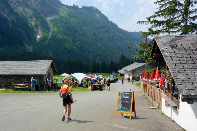 Vorbei an vielen kleinen Gipfeln zieht sich die Strecke auf guten Wegen den Kamm entlang. Auf den Almen sieht es aus, als ob gleich Heidi und Ziegenpeter um die Ecke biegen. Die traditionellen Häuser mit Holzschindeln sehen wirklich aus, wie aus dem Bilderbuch. Beim Col de la Croix ist die nächste Verpflegungsstation. Wir haben hier einen Marathon geschafft. In 12 Stunden. Das ist für mich Rekord. So lange war ich noch nie für einen Marathon unterwegs. Okay, wir haben auch schon fast 4000 Höhenmeter in den Beinen.