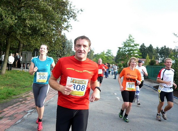 Der Veranstalter hat alles gut ausgeschildert und so findet jeder den Weg zur Umkleide, Taschenabgabe und später auch zu den Duschen. Neben dem Haus im Moor werden gerade die zwei Vierbeiner mit Herrchen bzw. Frauchen fotografiert von der örtlichen Presse, denn sie werden heute als Gespann auf der Marathonstrecke mitlaufen.