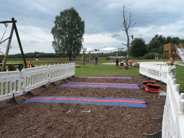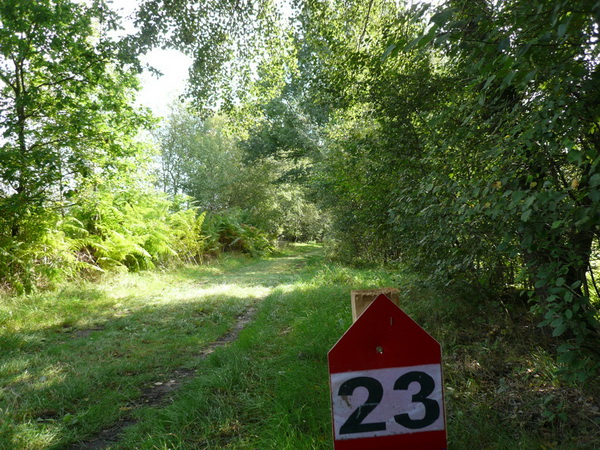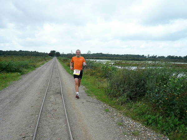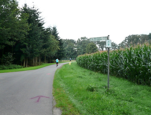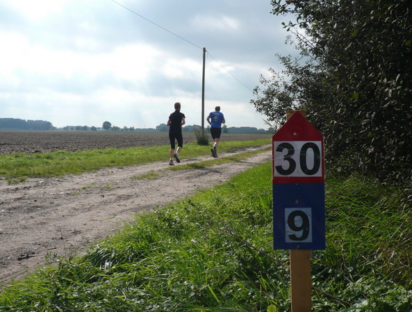 Die Strecke ist sehr gut ausgeschildert. Die Pfeile bzw. Km-Schilder haben die Farbe der Startnummer. Rot ist Marathon und blau ist Halbmarathon. Zusätzlich sind bei Richtungswechseln Leuchtpfeile auf dem Boden aufgesprüht. Verlaufen ist fast unmöglich. Am Ende des Wäldchens wird davor gewarnt, den Weg zu befahren. Der Untergrund ist nämlich weich und nicht tragfähig. An manchen Stellen sieht man Radspuren, die bis 1m tief sind. Für uns Läufer besteht da aber keine Gefahr.