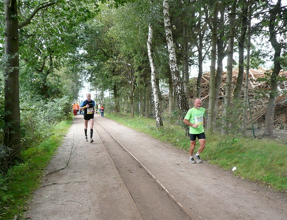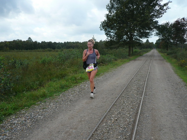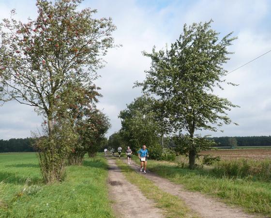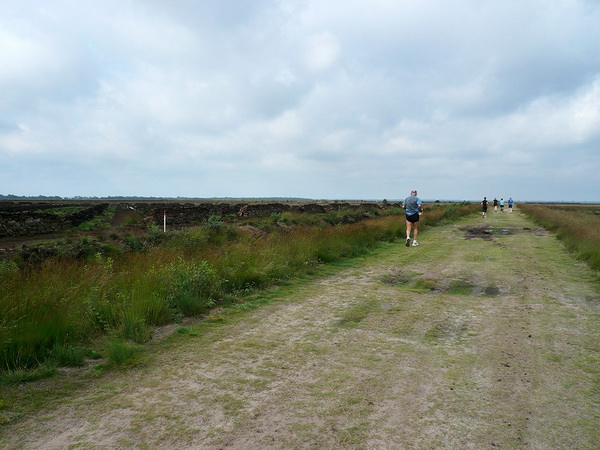 Wir laufen nach 3 km in Uhrzeigerrichtung in eine Ost-Süd-Schleife und ich komme mit Maria Rolfes ins Gespräch. Sie ist bisher alle Moormarathons mitgelaufen. Ihren 1. Marathon ist sie hier gelaufen und letztes Jahr auch ihren 100, heute ist es ihr 130. Marathon. Erst letztes Wochenende hat sie erfolgreich am 100 Meilenlauf in Berlin teilgenommen und nach 25:46:31 gefinisht. Als kleines Mädchen hat sie schon im Moor beim Umschichten ihr Taschengeld aufgebessert und hätte nie gedacht, nochmal eine so enge Bindung zum Moor zu bekommen. Sie ist mir dann enteilt und hat den Lauf als 4. Frau beendet.