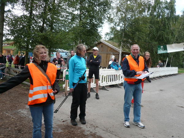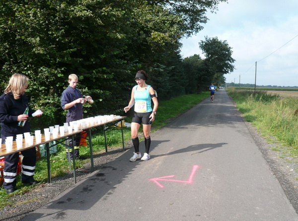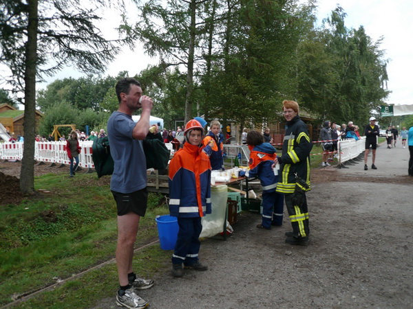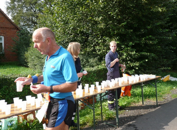 Wir laufen durch die Siedlung Mäkel und kommen an den südlichsten Punkt der Laufstrecke, wo sich wieder ein Versorgungspunkt befindet. Die V-Stellen werden fast überwiegend von Jugendlichen der umliegenden Feuerwehren betreut, die sehr eifrig sind. Toll, wie die Jugend mit eingebunden ist.
