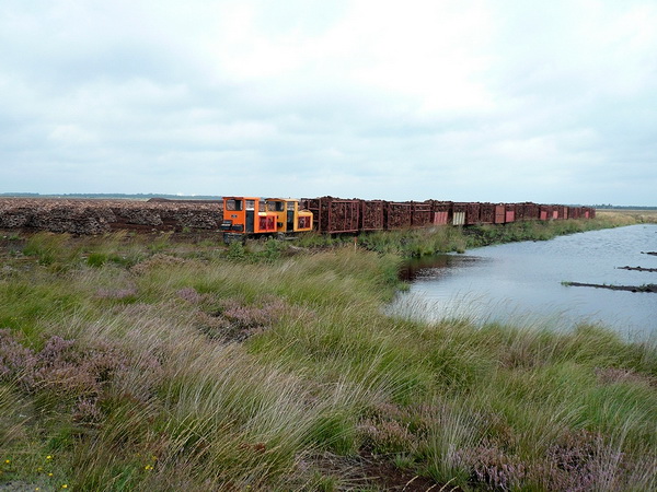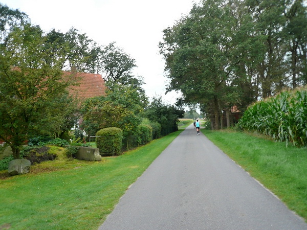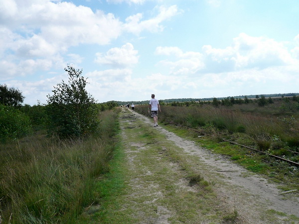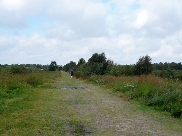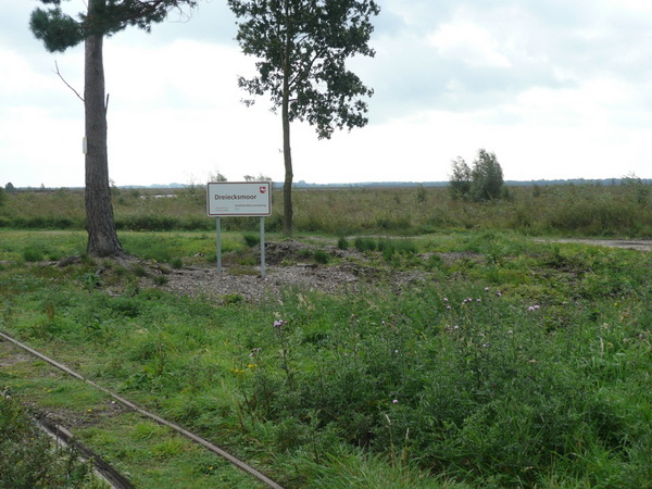 Zwischen km 3 und 4 weisen uns die Schienen der Moorbahn den Weg. Am Ende der Geraden biegen wir rechts ab und kommen an den ersten Versorgungspunkt. Wir verlassen die Schienen kurz mal und nach zwei Richtungswechseln geht es schnurgerade zum Voßberg, einer kleinen Erhöhung im Moor. Kurz vorher befindet sich der 2. Verpflegungspunkt am Maisfeld. Hier werden später die 13km-Läufer von unserer Strecke abbiegen. Nach einem kurzen Knick in Richtung Rödenbeck geht es über eine Asphaltstraße in Richtung Vogelsang. Die Laufstrecke führt nun ein kurzes Stück über den asphaltierten Weg. In diesem Teil des Moores finden wir immer wieder kleine Höfe, wo früher nur Moorfläche war. Die Moore wurden entwässert und urbar gemacht, der Torf wurde als Brennstoff oder Dünger genutzt. Hierzu gibt es einen alten Spruch: „Den Ersten sien Dod, den Tweeten sien Not, den Drütten sien Brod“.