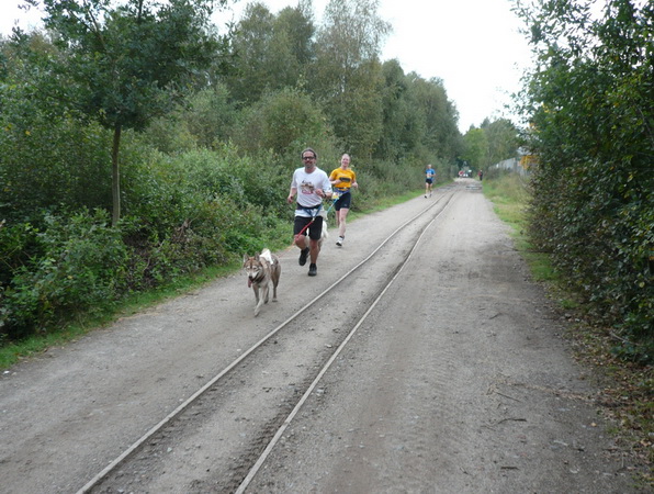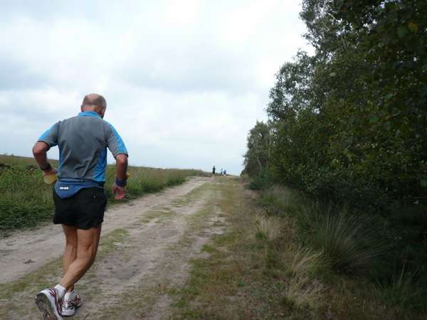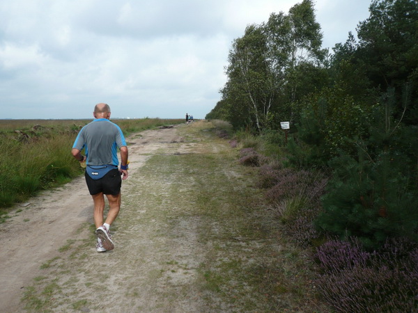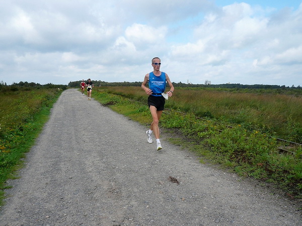 Bei km 20 kommen mir auf einer kurzen Begegnungsstrecke schon Läufer entgegen, die auf der 2. Runde sind. Das Feld ist jetzt erheblich ausgedünnt. Wir haben unsere Schleife fast beendet und kommen wieder an die große, nicht endende lange Gerade, die uns jetzt jedoch in die andere Richtung führt. Hier kommen mir Fjelline und Ylvi Smilla die zwei Marathonhunde mit Begleitung entgegen. Nach rund einem Kilometer sind wir wieder am Haus im Moor und die Halbmarathonis haben ihr Soll erfüllt.