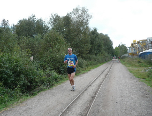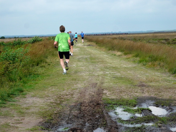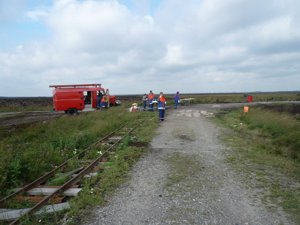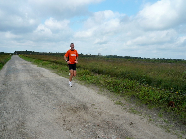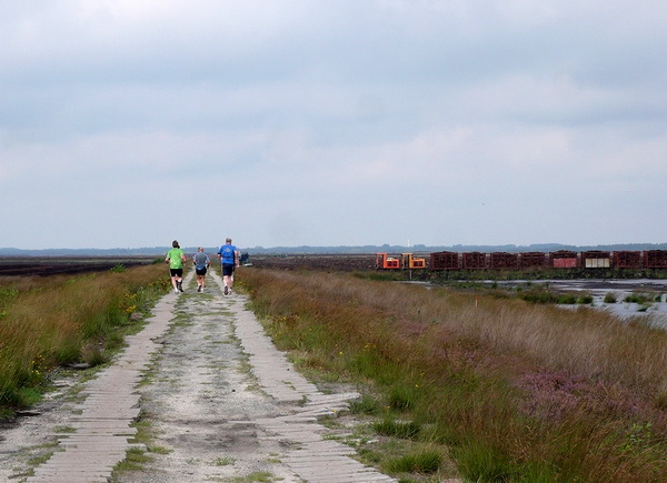 Als wir ins Freie kommen, sind wir mitten im Torfabbau, so weit das Auge reicht. Am Horizont sehen wir die Türme vom Torfwerk – da müssen wir hin. Es sieht unendlich weit aus, sind aber nur 5km. Hier wird das Auge durch die Weite des Moores ganz schön getäuscht. Der Weg ist weiterhin weich und es gibt viele kurze Wellen, die einem aus dem Laufrhythmus bringen. Kurz vor km 19 an einem alten Feuerwehrauto warten wieder Jugendliche, um uns mit Wasser, Iso oder Cola zu versorgen. Das letzte Stück sind wir auf kleinen Betonplatten gelaufen, die aber wegen des weichen Untergrundes sehr uneben liegen.