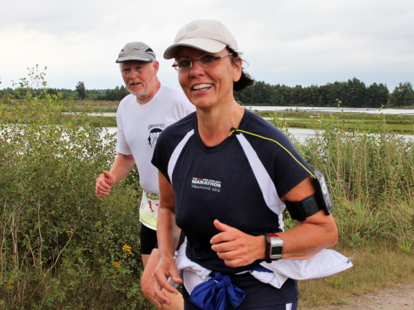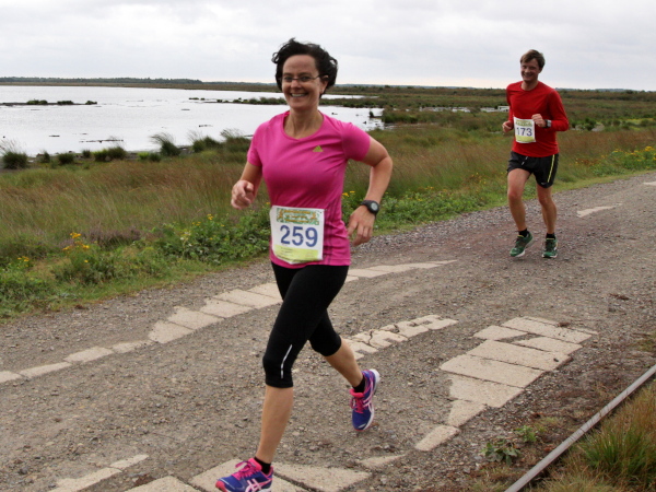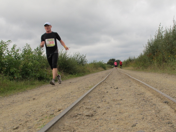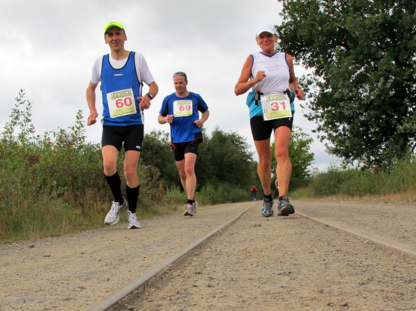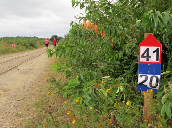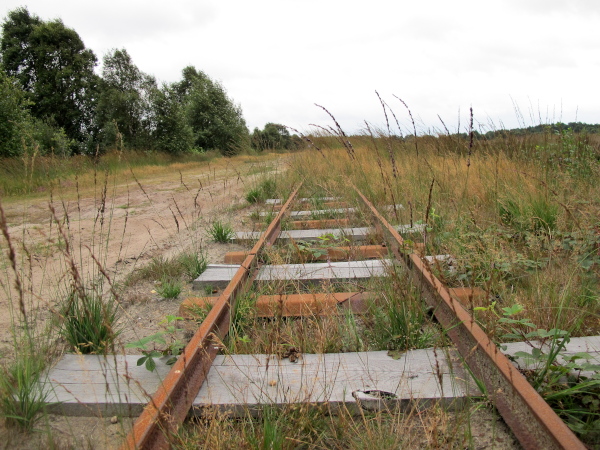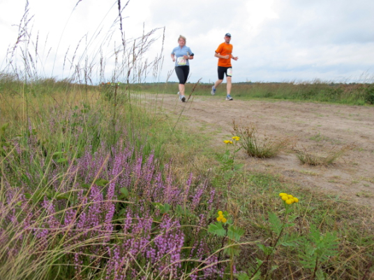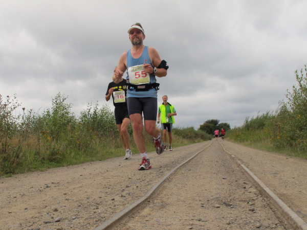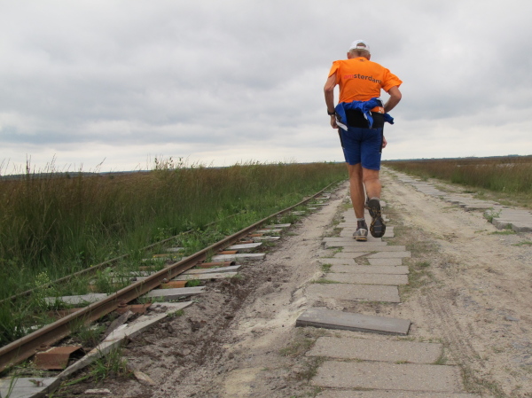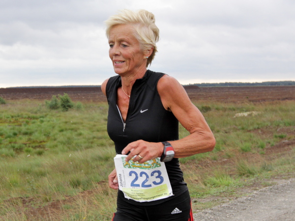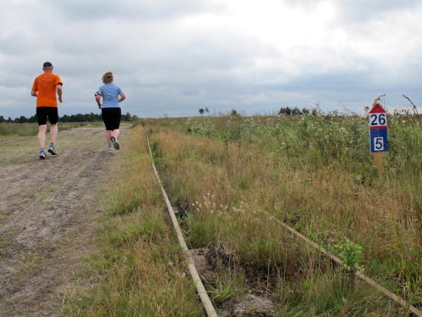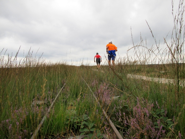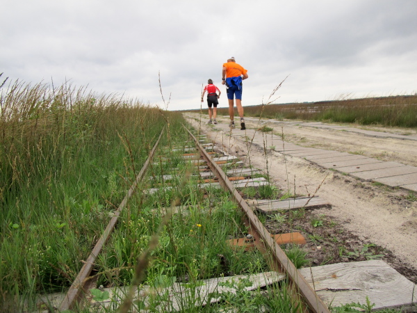 Ich staune, welche Abwechslung eine schnurgerade Strecke durch karge Landschaft bietet. Immer wieder bleibe ich stehen, fotografiere zwischen den Bahngleisen wucherndes Heidekraut und viele nur im Moor vorkommende Pflanzen und Gräser. Sogar ein Büschel Wollgras kann ich entdecken. „Neue Bestzeit wird das heute nicht“, bemerkt eine Läuferin richtig.