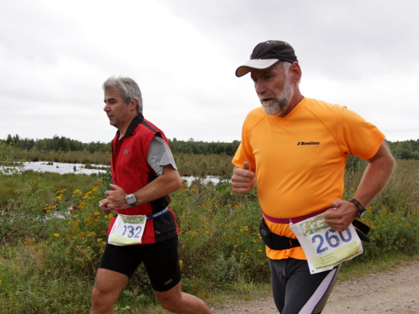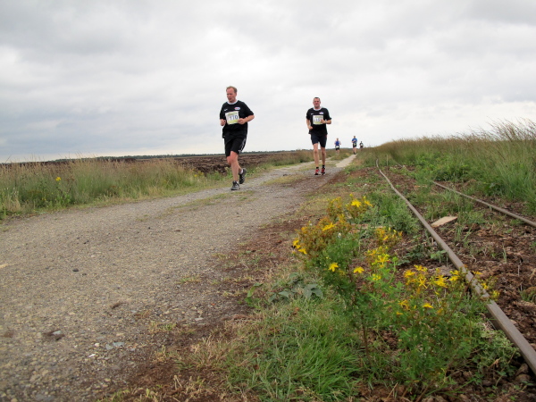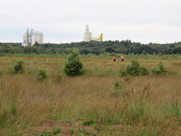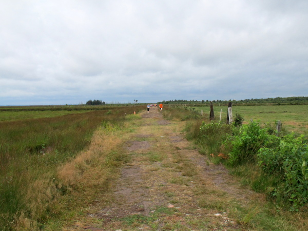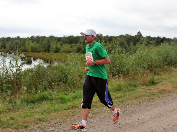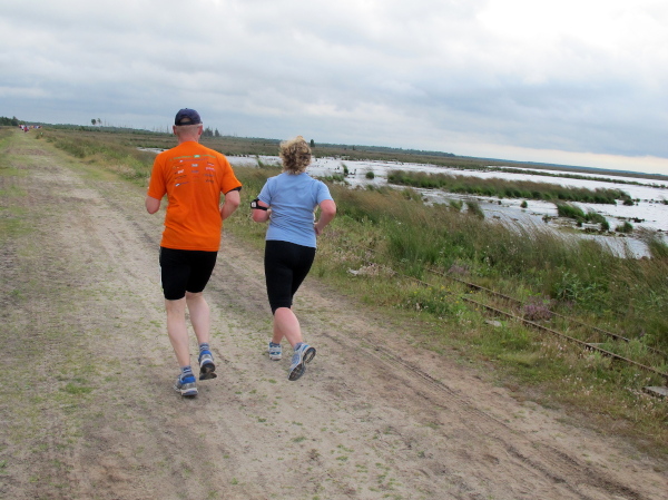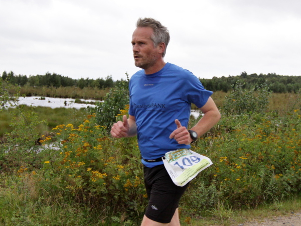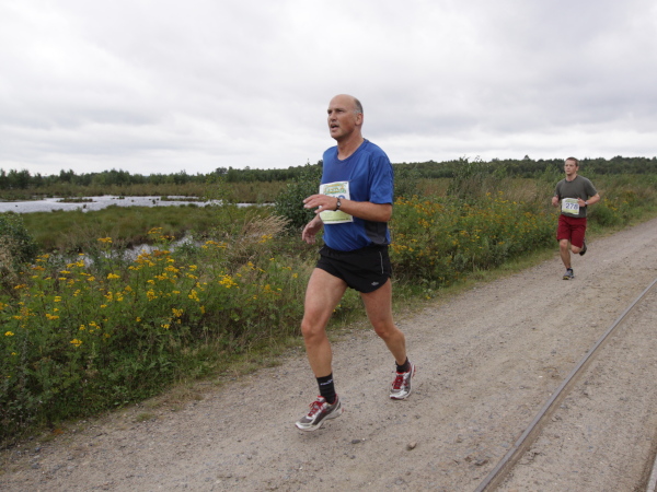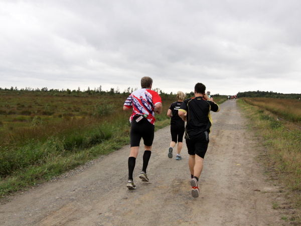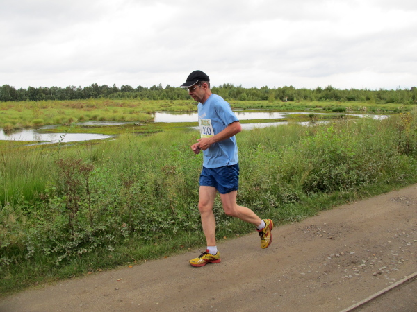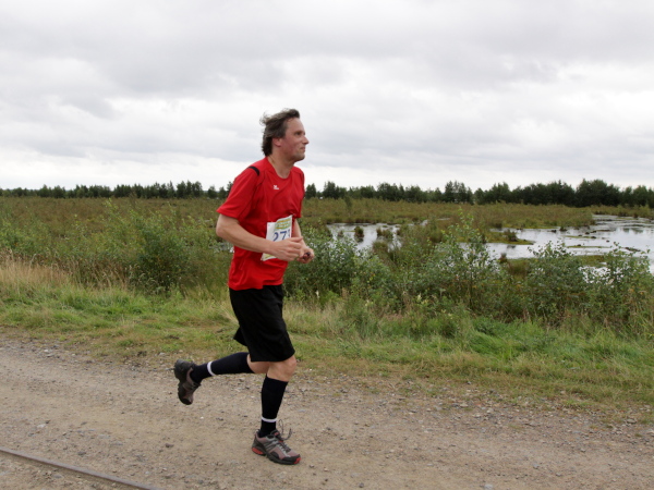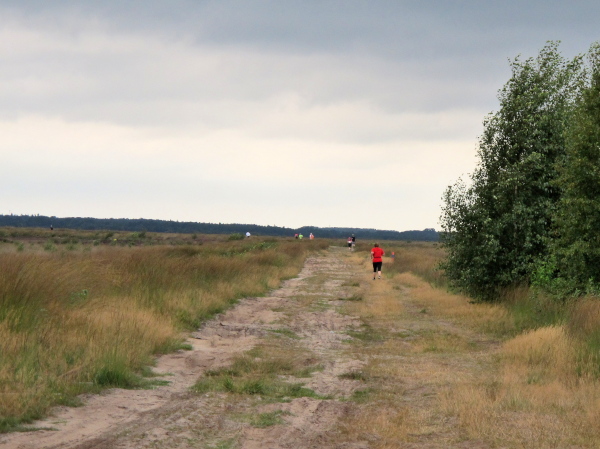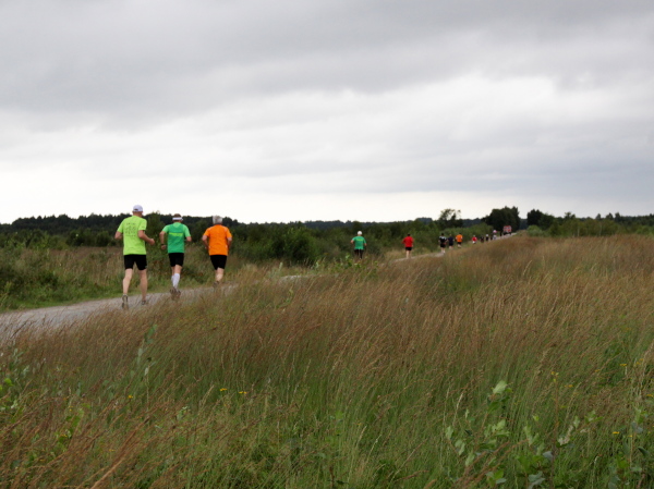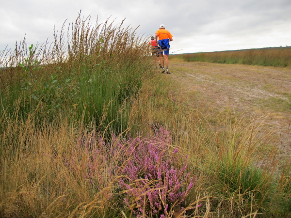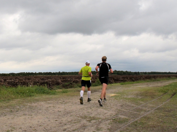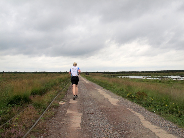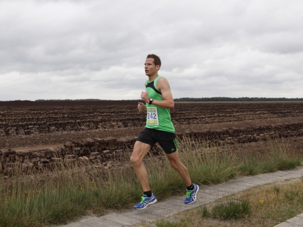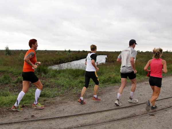 Nach den zuletzt heißen Tagen macht auch im Norden der Sommer Pause. Eine geschlossene, dunkle Wolkendecke liegt über der Moorlandschaft. Das passt zu dieser kargen, lebensfeindlichen Umgebung auch viel besser, als strahlend blauer Himmel. Fast läuferfeindlich ist zunächst der Weg, denn Sand und tiefe Furchen lassen keine gleichmäßigen Schritte zu. Kaum einen Blick hat da mancher für die fremdartigen und unterschiedlichen Landschaftsformen. Große Wasserflächen wechseln sich mit heideartigen Grünflächen ab. Seen sind das aber nicht, sondern abgebaute Torfflächen, auf denen jetzt ca. 10 cm das Wasser steht und sich Millimeter um Millimeter (ca. 1 pro Jahr) neuer Torf bildet. Auf den höher liegenden Grünflächen wurde noch kein Torf gestochen.