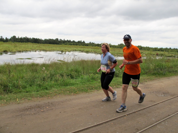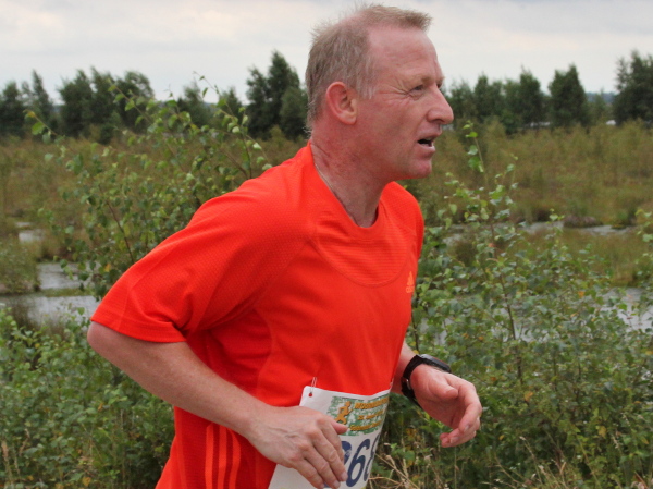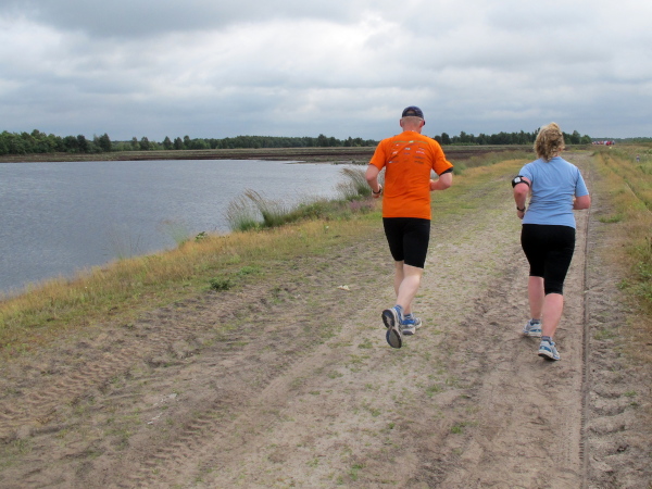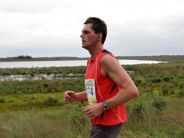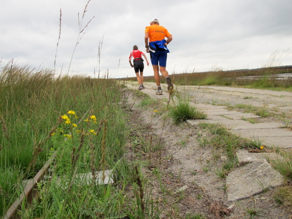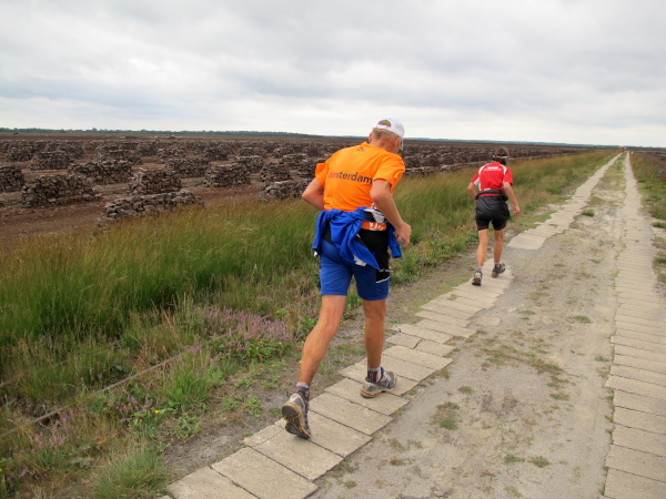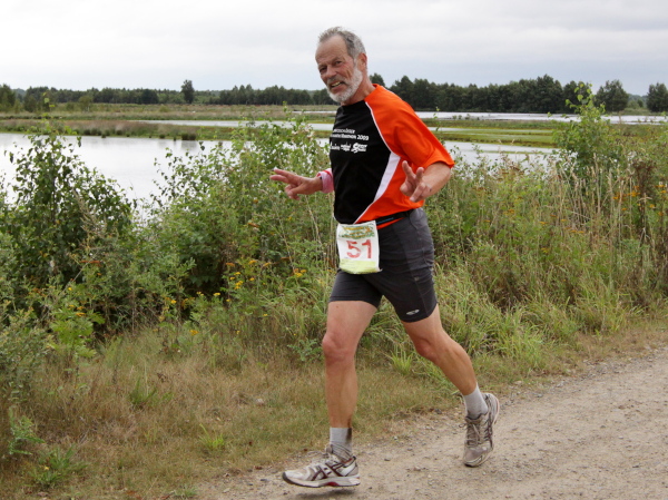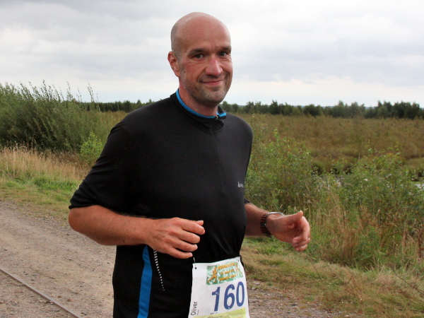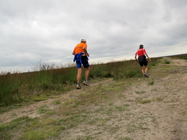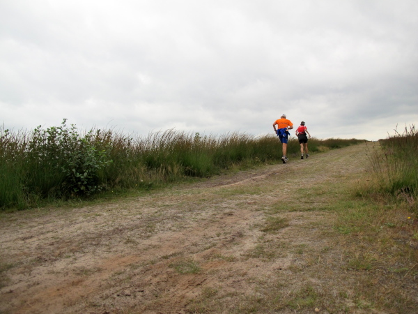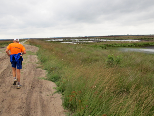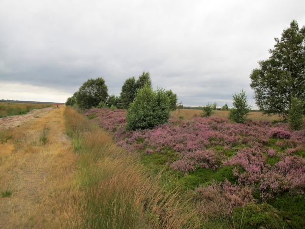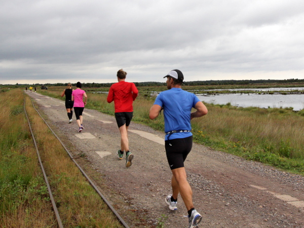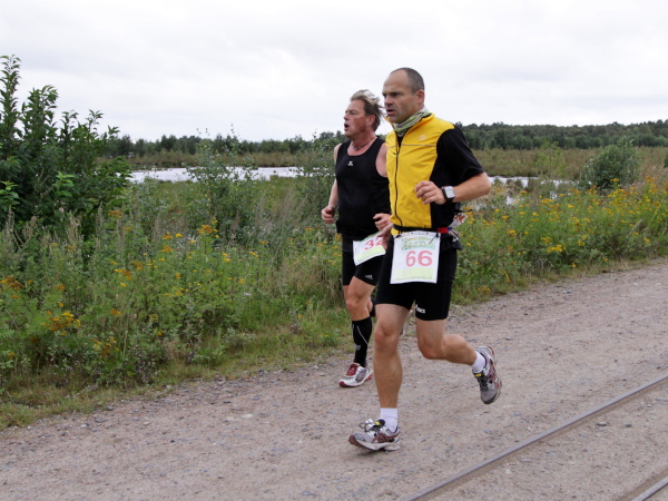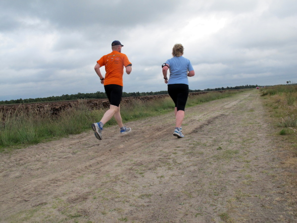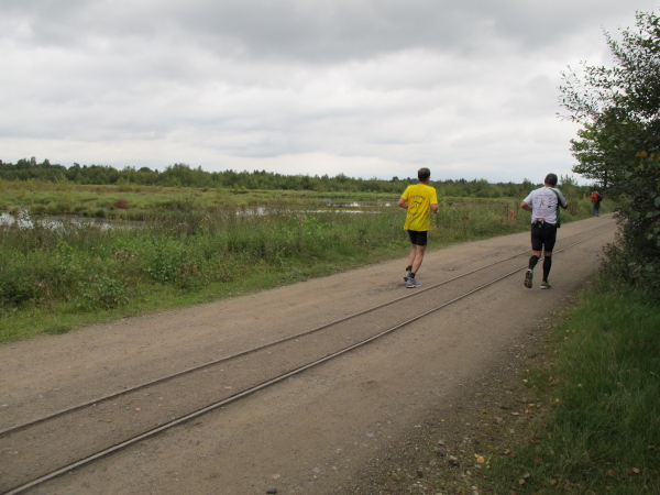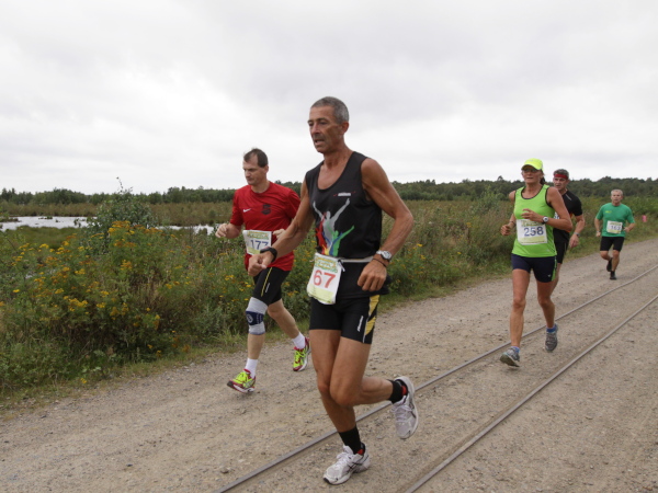 Nach den zuletzt heißen Tagen macht auch im Norden der Sommer Pause. Eine geschlossene, dunkle Wolkendecke liegt über der Moorlandschaft. Das passt zu dieser kargen, lebensfeindlichen Umgebung auch viel besser, als strahlend blauer Himmel. Fast läuferfeindlich ist zunächst der Weg, denn Sand und tiefe Furchen lassen keine gleichmäßigen Schritte zu. Kaum einen Blick hat da mancher für die fremdartigen und unterschiedlichen Landschaftsformen. Große Wasserflächen wechseln sich mit heideartigen Grünflächen ab. Seen sind das aber nicht, sondern abgebaute Torfflächen, auf denen jetzt ca. 10 cm das Wasser steht und sich Millimeter um Millimeter (ca. 1 pro Jahr) neuer Torf bildet. Auf den höher liegenden Grünflächen wurde noch kein Torf gestochen.
