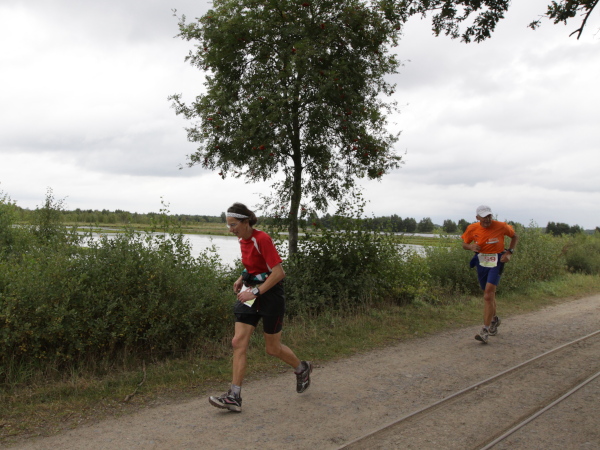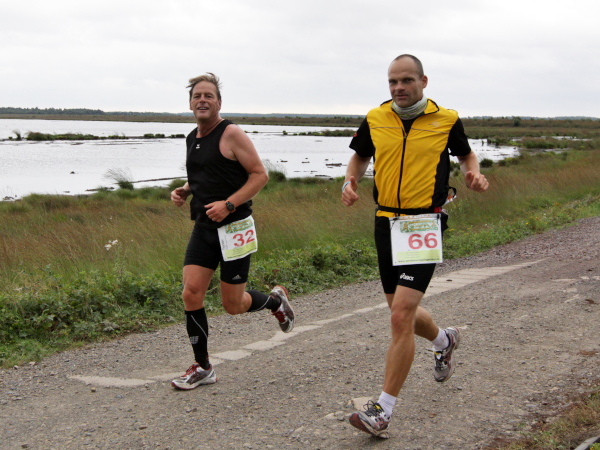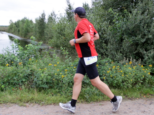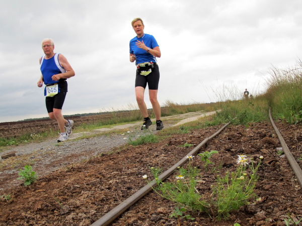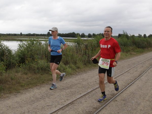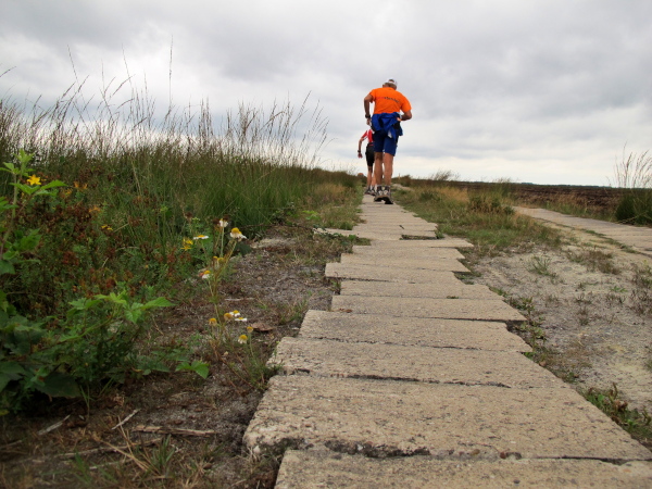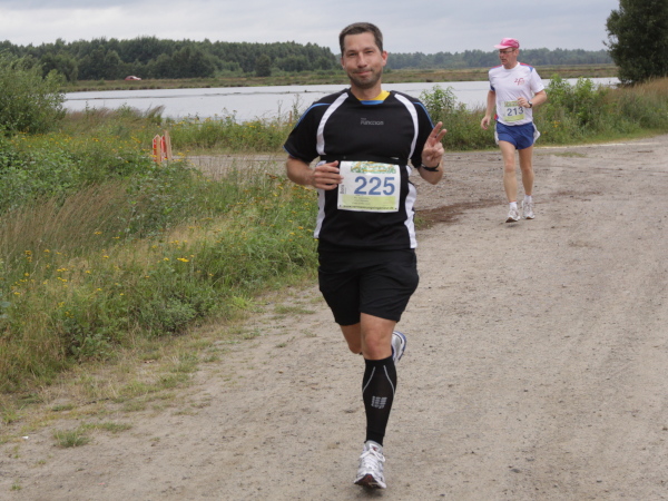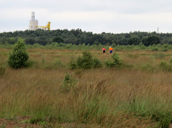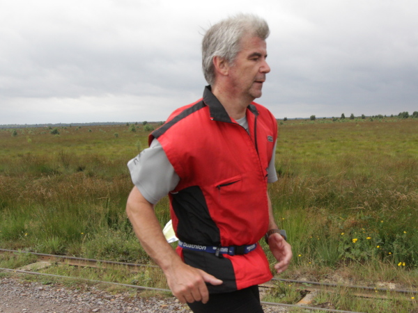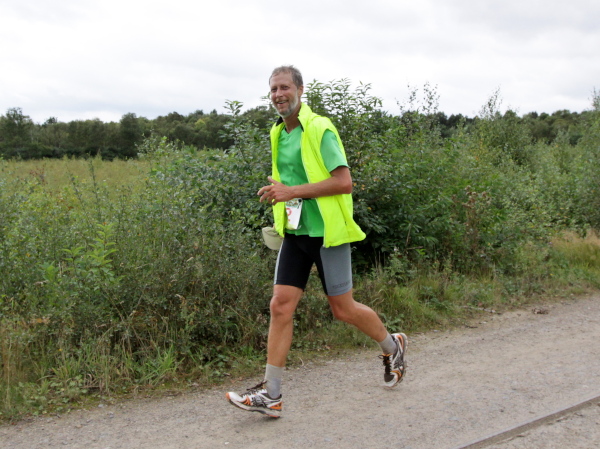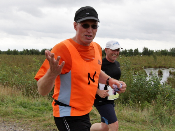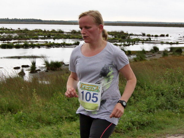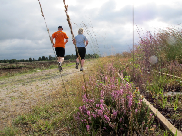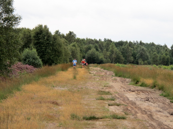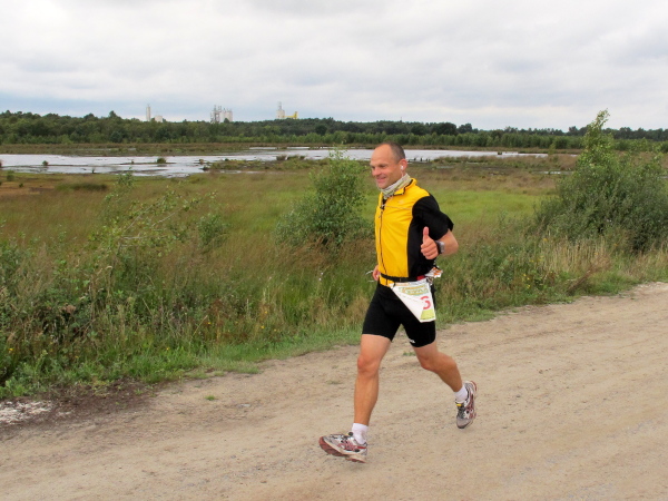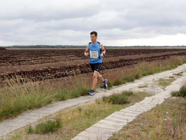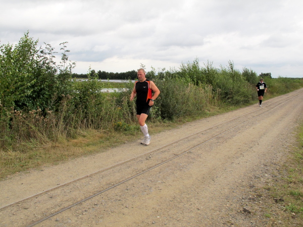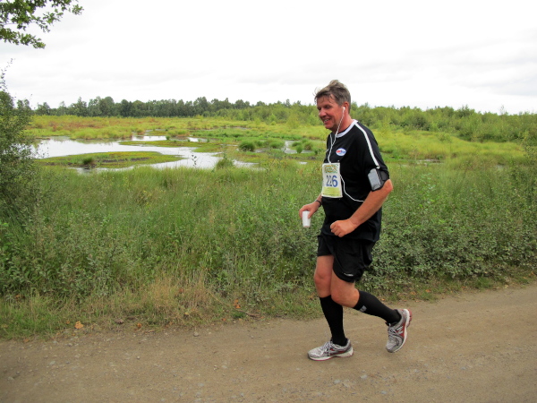 Nach den zuletzt heißen Tagen macht auch im Norden der Sommer Pause. Eine geschlossene, dunkle Wolkendecke liegt über der Moorlandschaft. Das passt zu dieser kargen, lebensfeindlichen Umgebung auch viel besser, als strahlend blauer Himmel. Fast läuferfeindlich ist zunächst der Weg, denn Sand und tiefe Furchen lassen keine gleichmäßigen Schritte zu. Kaum einen Blick hat da mancher für die fremdartigen und unterschiedlichen Landschaftsformen. Große Wasserflächen wechseln sich mit heideartigen Grünflächen ab. Seen sind das aber nicht, sondern abgebaute Torfflächen, auf denen jetzt ca. 10 cm das Wasser steht und sich Millimeter um Millimeter (ca. 1 pro Jahr) neuer Torf bildet. Auf den höher liegenden Grünflächen wurde noch kein Torf gestochen.