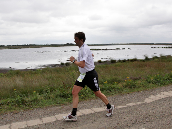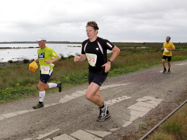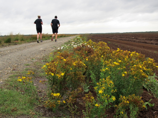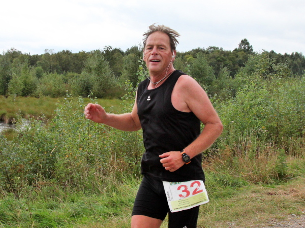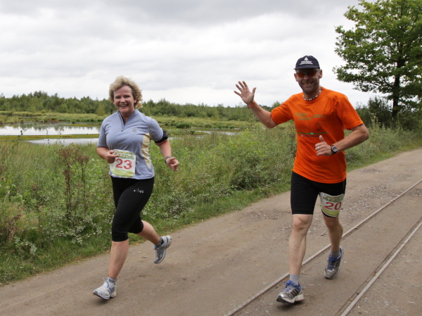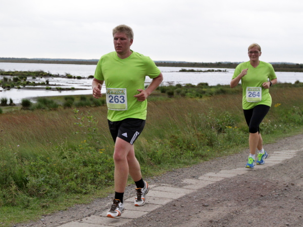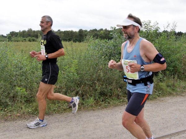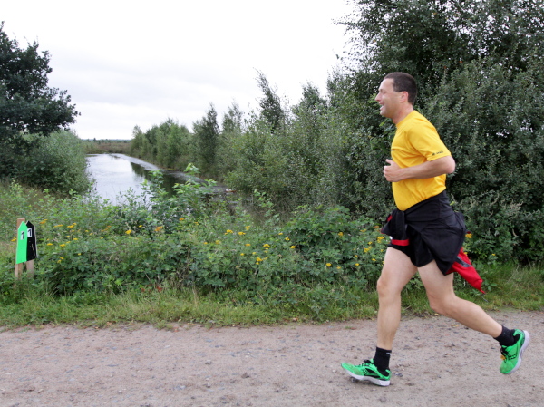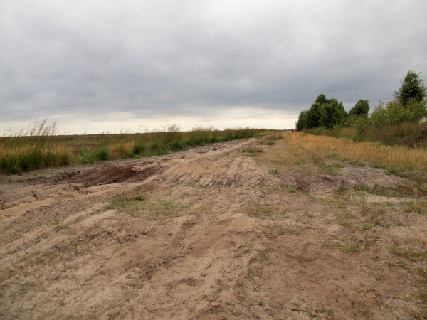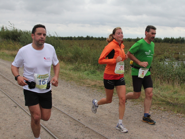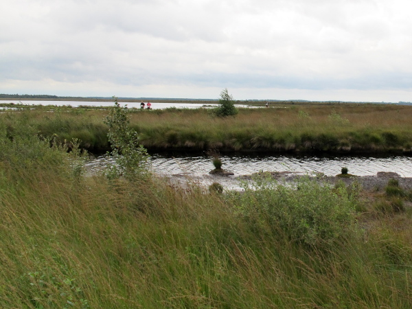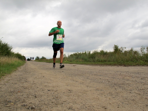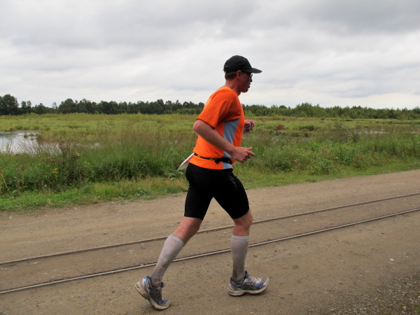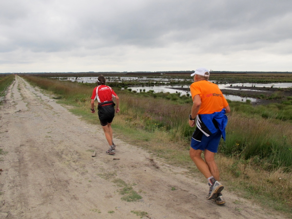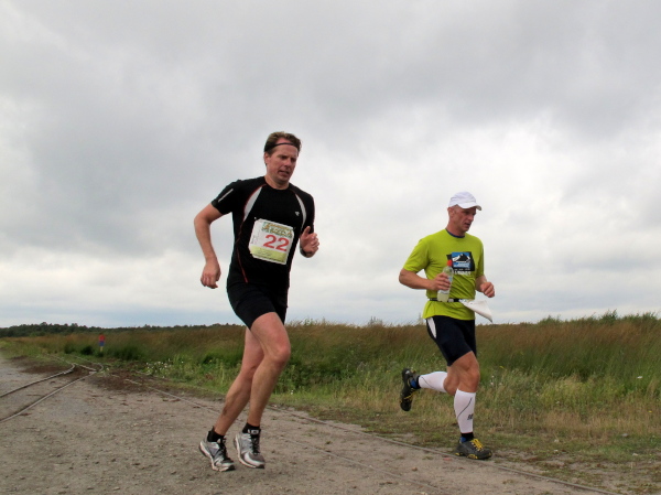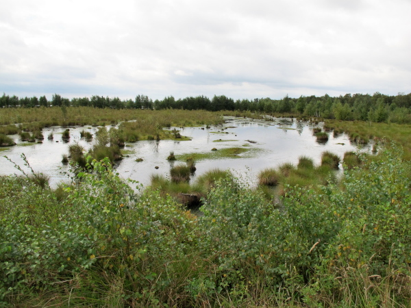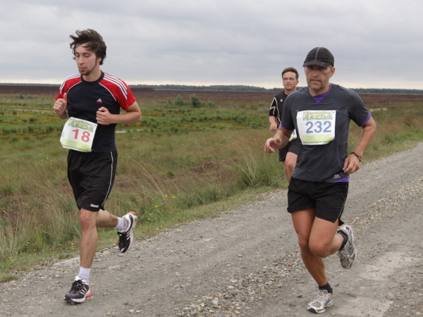 Nach den zuletzt heißen Tagen macht auch im Norden der Sommer Pause. Eine geschlossene, dunkle Wolkendecke liegt über der Moorlandschaft. Das passt zu dieser kargen, lebensfeindlichen Umgebung auch viel besser, als strahlend blauer Himmel. Fast läuferfeindlich ist zunächst der Weg, denn Sand und tiefe Furchen lassen keine gleichmäßigen Schritte zu. Kaum einen Blick hat da mancher für die fremdartigen und unterschiedlichen Landschaftsformen. Große Wasserflächen wechseln sich mit heideartigen Grünflächen ab. Seen sind das aber nicht, sondern abgebaute Torfflächen, auf denen jetzt ca. 10 cm das Wasser steht und sich Millimeter um Millimeter (ca. 1 pro Jahr) neuer Torf bildet. Auf den höher liegenden Grünflächen wurde noch kein Torf gestochen.
