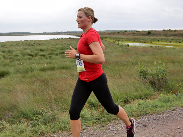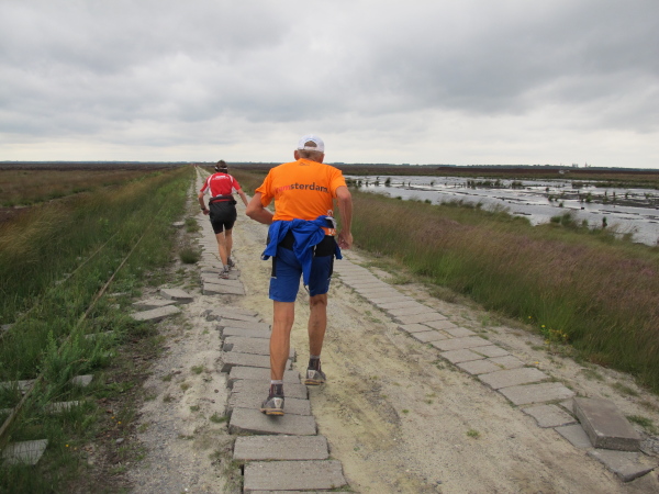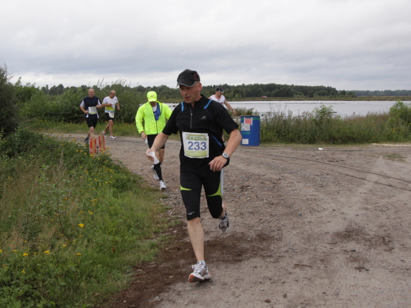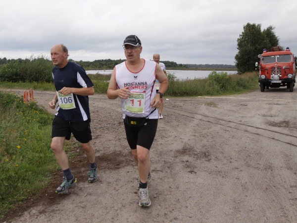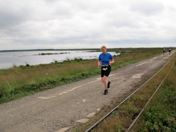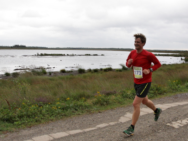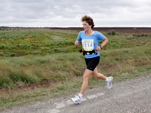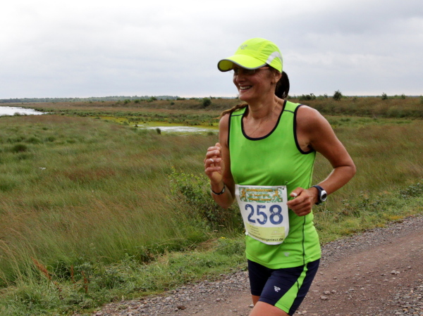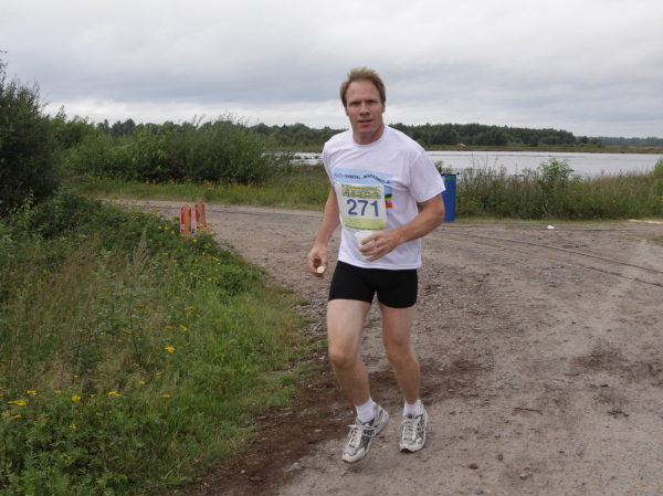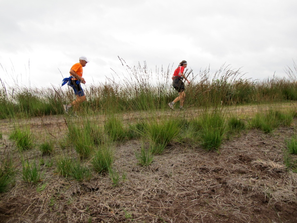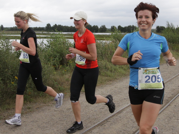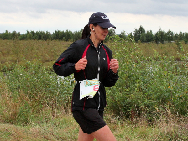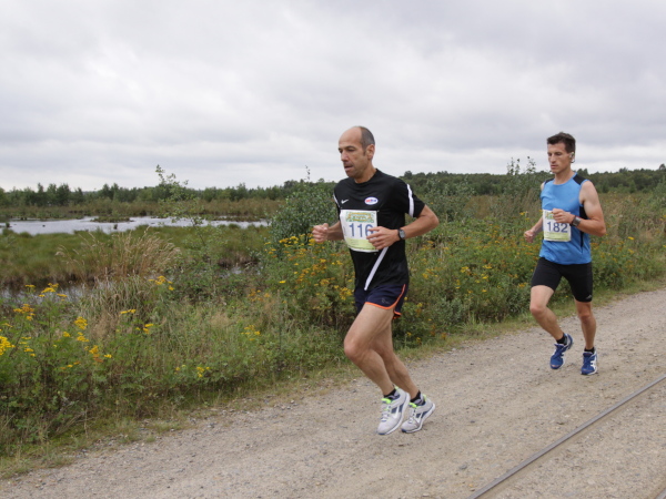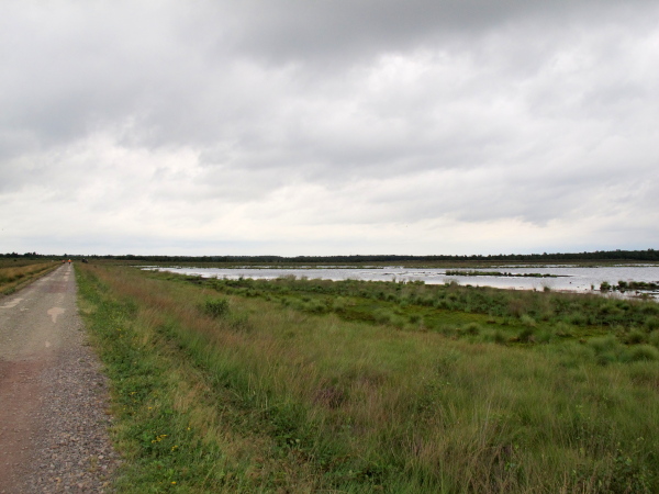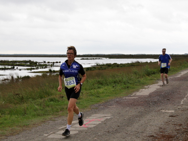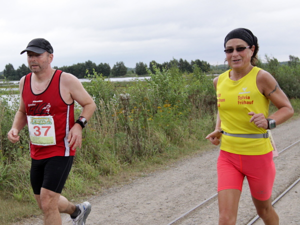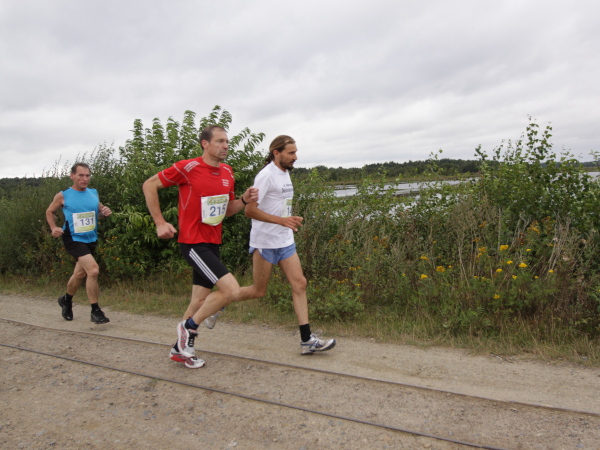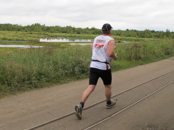 Nach den zuletzt heißen Tagen macht auch im Norden der Sommer Pause. Eine geschlossene, dunkle Wolkendecke liegt über der Moorlandschaft. Das passt zu dieser kargen, lebensfeindlichen Umgebung auch viel besser, als strahlend blauer Himmel. Fast läuferfeindlich ist zunächst der Weg, denn Sand und tiefe Furchen lassen keine gleichmäßigen Schritte zu. Kaum einen Blick hat da mancher für die fremdartigen und unterschiedlichen Landschaftsformen. Große Wasserflächen wechseln sich mit heideartigen Grünflächen ab. Seen sind das aber nicht, sondern abgebaute Torfflächen, auf denen jetzt ca. 10 cm das Wasser steht und sich Millimeter um Millimeter (ca. 1 pro Jahr) neuer Torf bildet. Auf den höher liegenden Grünflächen wurde noch kein Torf gestochen.
