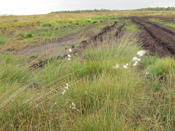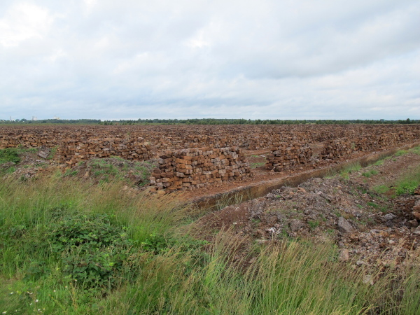 Unsere Eindrücke werden komplettiert, denn jetzt sehen wir die ersten Torfabbauflächen, leicht zu erkennen an den zum Trocknen aufgestapelten Torfsoden. Während das Torfstechen inzwischen natürlich von Maschinen übernommen wird, ist das Stapeln wie in alten Zeiten harte Handarbeit. Die getrockneten Torfsoden wurden auch als Brennmaterial genutzt. Der Heizwert war ähnlich wie bei der Braunkohle.