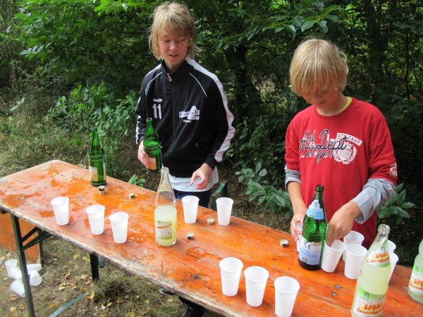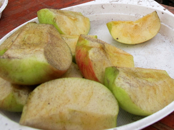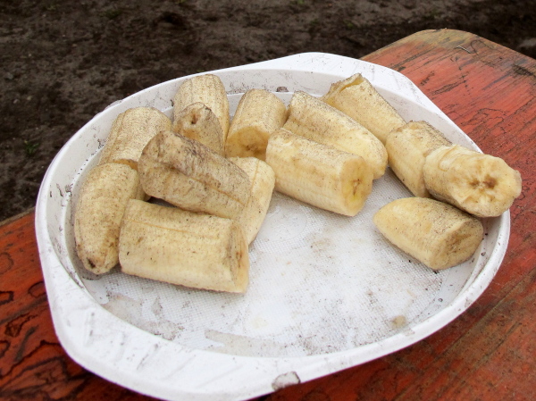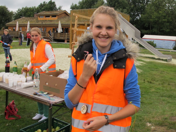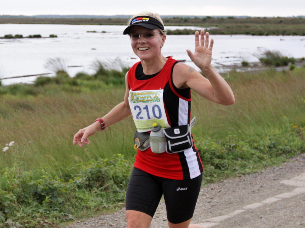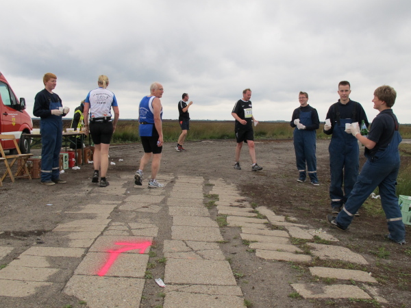 An der nächsten Verpflegungsstelle gibt es Bananen und Äpfel mit Moorwürze, denn das Obst ist mit einer schwarzbraunen Staubschicht überzogen. Was man sonst gar nicht sieht und spürt: durch den Wind werden feinste Torfpartikel in die Luft gewirbelt. Mal sehen, wie es nachher in den Duschen ausschaut.