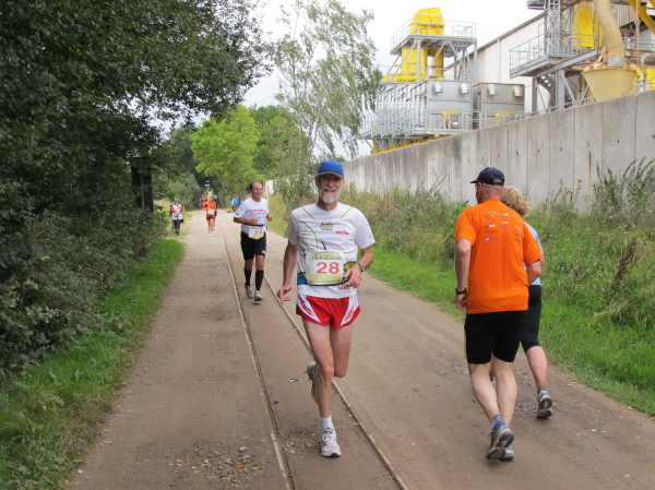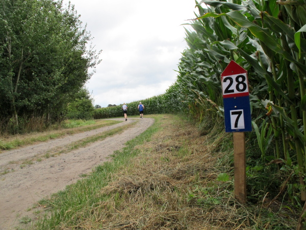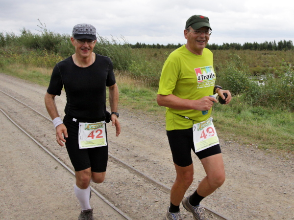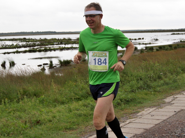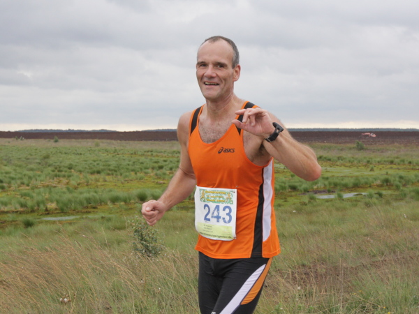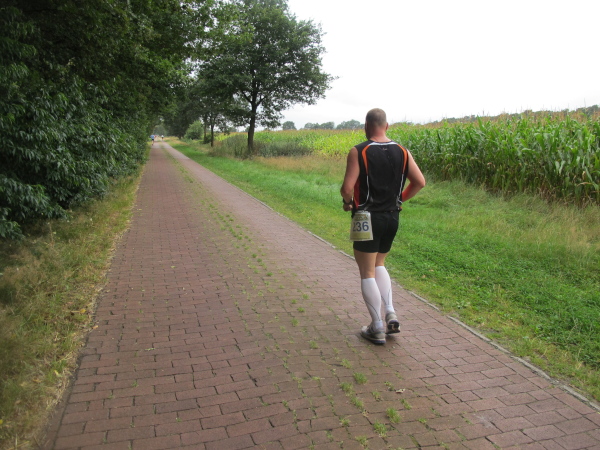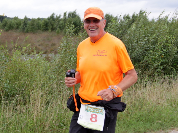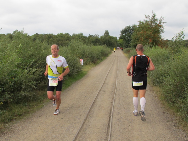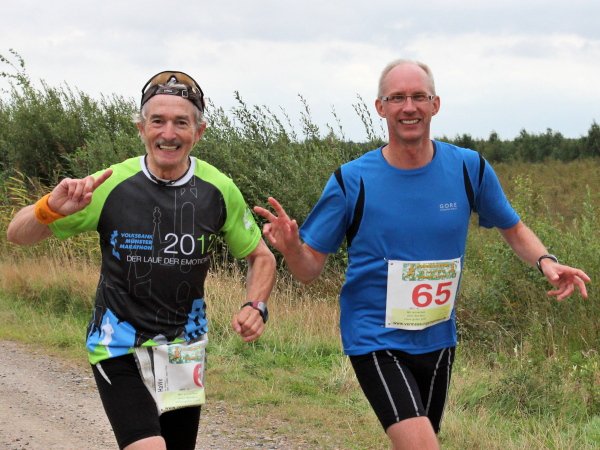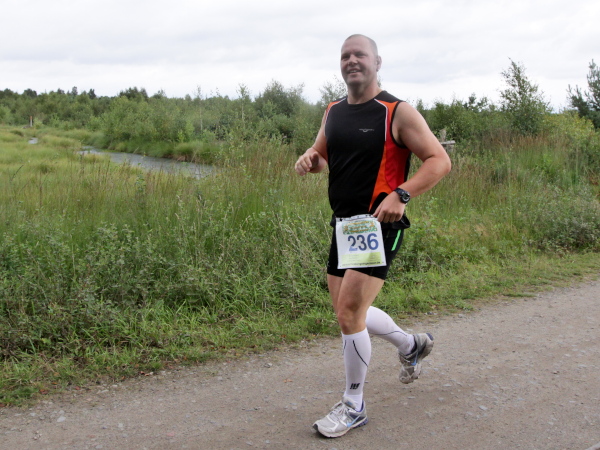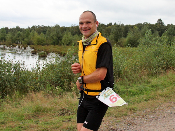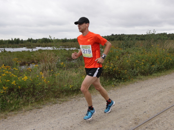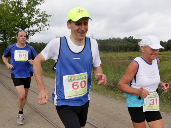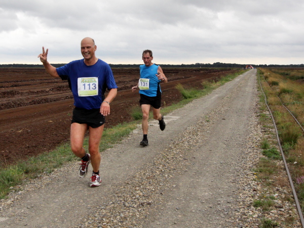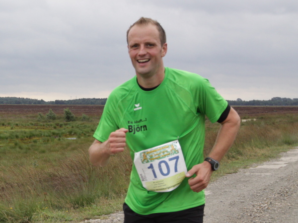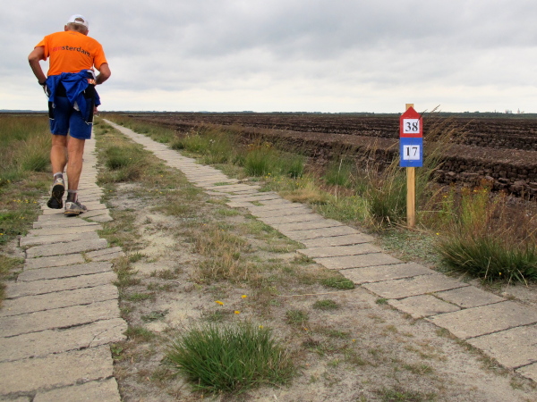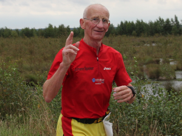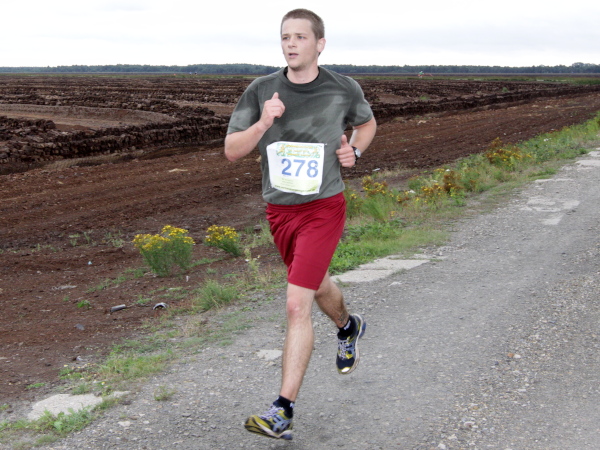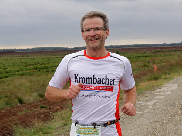 Ungefähr 2,5 km vor dem Ziel kommen uns die Marathonis entgegen, die auf ihrer zweiten Runde bereits wieder 5,5 km zurückgelegt haben. Einen von ihnen muss ich unbedingt erwähnen, denn er trägt einen Namen, den hier jeder kennt: Johann Spieker. Der muntere Ultraläufer hat einen berühmten Namensvetter, der als Kiepenkerl und Hausierer 1828 hier im Moor tot aufgefunden wurde. Seine Leiche konnte aus dem Moor nicht geborgen werden und so begrub man ihn an Ort und Stelle. Als das Abtorfen begann, ließ man das Grab unangetastet, bis der irgendwann einmal meterhohe Torfturm in sich zusammenfiel. Von der Leiche Johann Spiekers fand man nur noch einen Haarbüschel, aber Teile seiner Jacke waren noch gut erhalten, ebenso ein paar Knöpfe und Münzen. Das alles kann man sich im Museum anschauen.