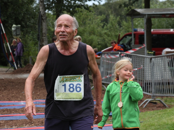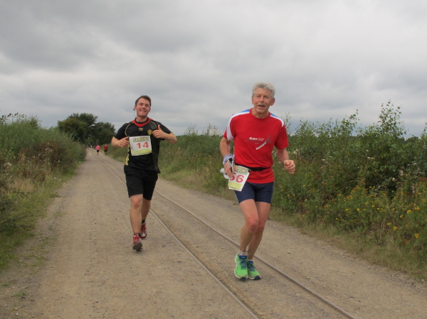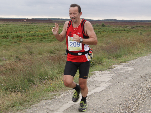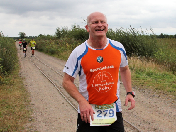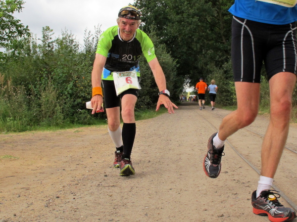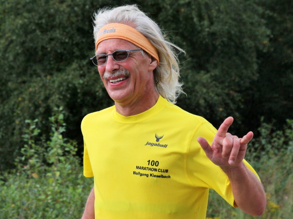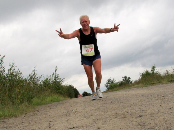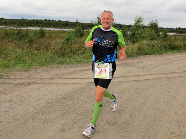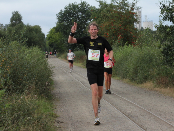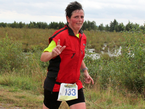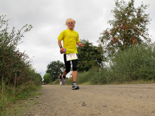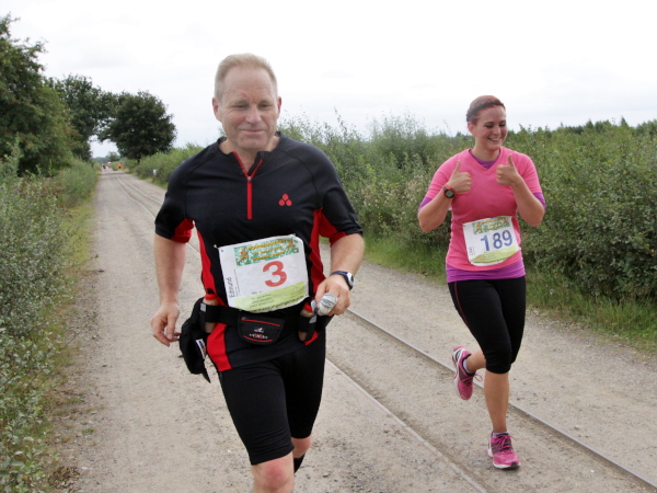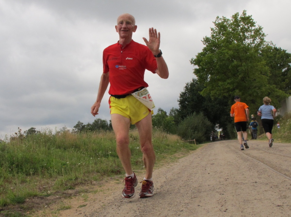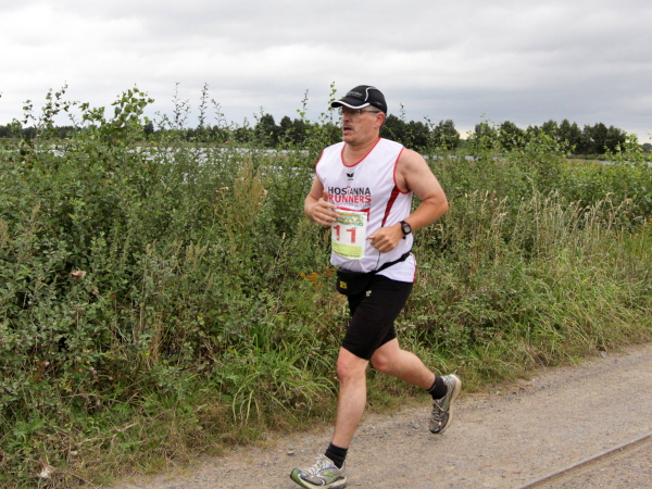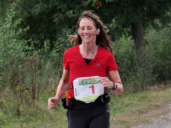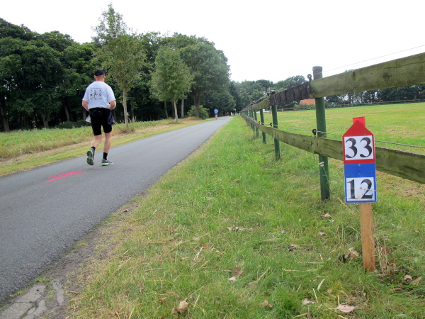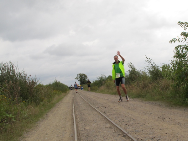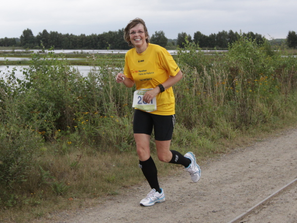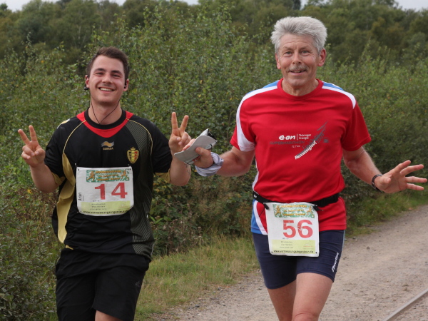Ungefähr 2,5 km vor dem Ziel kommen uns die Marathonis entgegen, die auf ihrer zweiten Runde bereits wieder 5,5 km zurückgelegt haben. Einen von ihnen muss ich unbedingt erwähnen, denn er trägt einen Namen, den hier jeder kennt: Johann Spieker. Der muntere Ultraläufer hat einen berühmten Namensvetter, der als Kiepenkerl und Hausierer 1828 hier im Moor tot aufgefunden wurde. Seine Leiche konnte aus dem Moor nicht geborgen werden und so begrub man ihn an Ort und Stelle. Als das Abtorfen begann, ließ man das Grab unangetastet, bis der irgendwann einmal meterhohe Torfturm in sich zusammenfiel. Von der Leiche Johann Spiekers fand man nur noch einen Haarbüschel, aber Teile seiner Jacke waren noch gut erhalten, ebenso ein paar Knöpfe und Münzen. Das alles kann man sich im Museum anschauen.