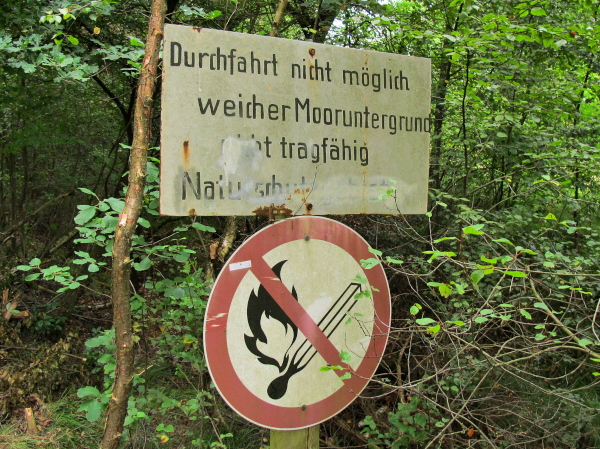 Auf den nächsten 8 Kilometern kann man da einiges wettmachen. Die Wege durch Wiesen, abgeerntete Getreide- und über 2 m hoch stehende Maisfelder sind meist asphaltiert und zu schauen gibt es nicht viel. Richtig froh bin ich, als wir durch ein kleines, verwildertes Wäldchen wieder ins Moor kommen. Es ist still, denn im Moor leben nur wenige Tiere. Und die meisten davon machen wenig Krach, wie zum Beispiel die gefürchtete Kreuzotter. Deren Gift ist zwar giftiger als das mancher Klapperschlange, aber trotzdem ungefährlich, weil sie es nur in ganz geringer Dosis einsetzt. Außerdem ist die Wahrscheinlichkeit, einer Kreuzotter zu begegnen, sehr gering. Schon wenn sie die im Moor deutlich auftretenden Bodenschwingungen wahrnimmt, ergreift sie die Flucht.